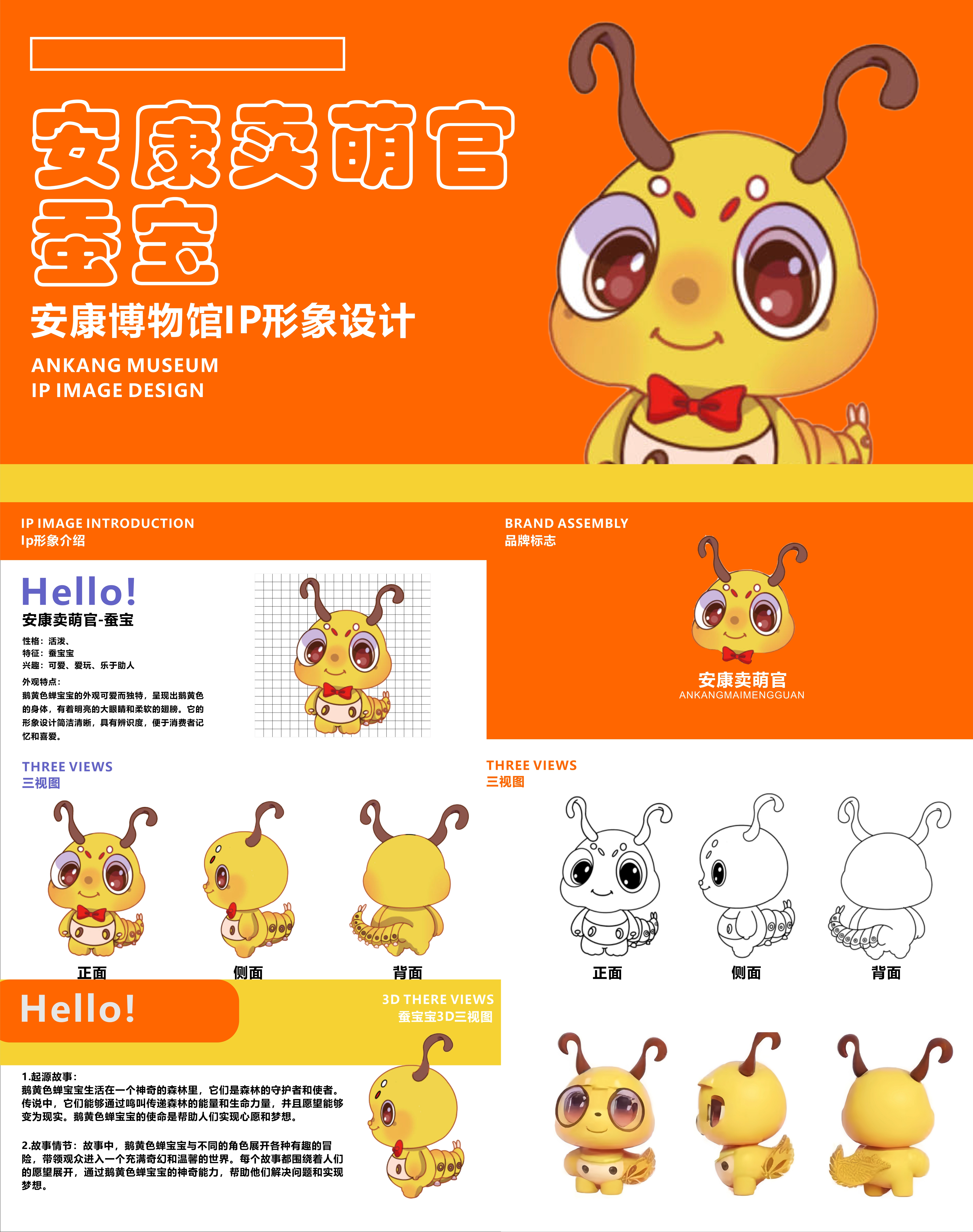 外观:蚕宝的外观以一只敦实的蚕宝为基础,体态圆润,身躯呈现明亮的颜色,充满活力和童趣。有大眼睛,憨态可掬,鼓起的小嘴巴显示出它的灵动和可爱。 颜色:蚕宝以明亮的黄色为基调,给人一种欢乐和温暖的感觉。 动作:蚕宝的动作灵活自如,婴儿般的可爱表情和卖萌的姿态令人难以抗拒。喜欢跳动、摇摆、扭动身体,表达出喜悦、好奇和友善等情感。