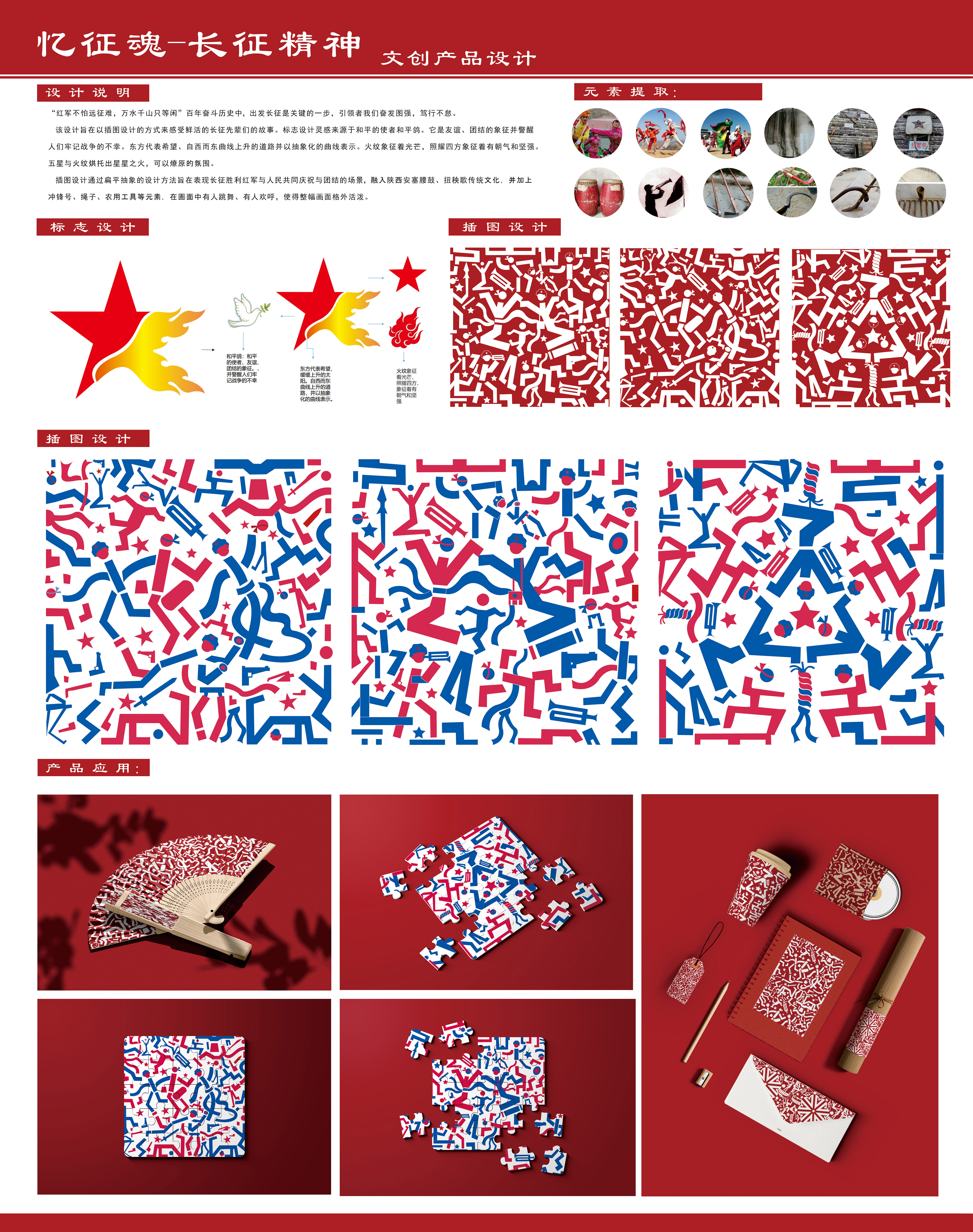 该设计旨在以插图设计的方式来感受鲜活的长征先辈们的故事。标志设计灵感来源于和平的使者和平鸽。东方代表希望、自西而东曲线上升的道路。并以抽象化的曲线表示,五星与火纹烘托出星星之火,可以燎原的氛围。插图设计通过扁平抽象的设计方法旨在表现长征胜利红军与人民共同庆祝与团结的场景,融入陕西安塞腰鼓、扭秧歌传统文化,并加上冲锋号、绳子、农用工具等元素,在画面中有人跳舞、有人欢呼,使得整幅画面格外活泼。