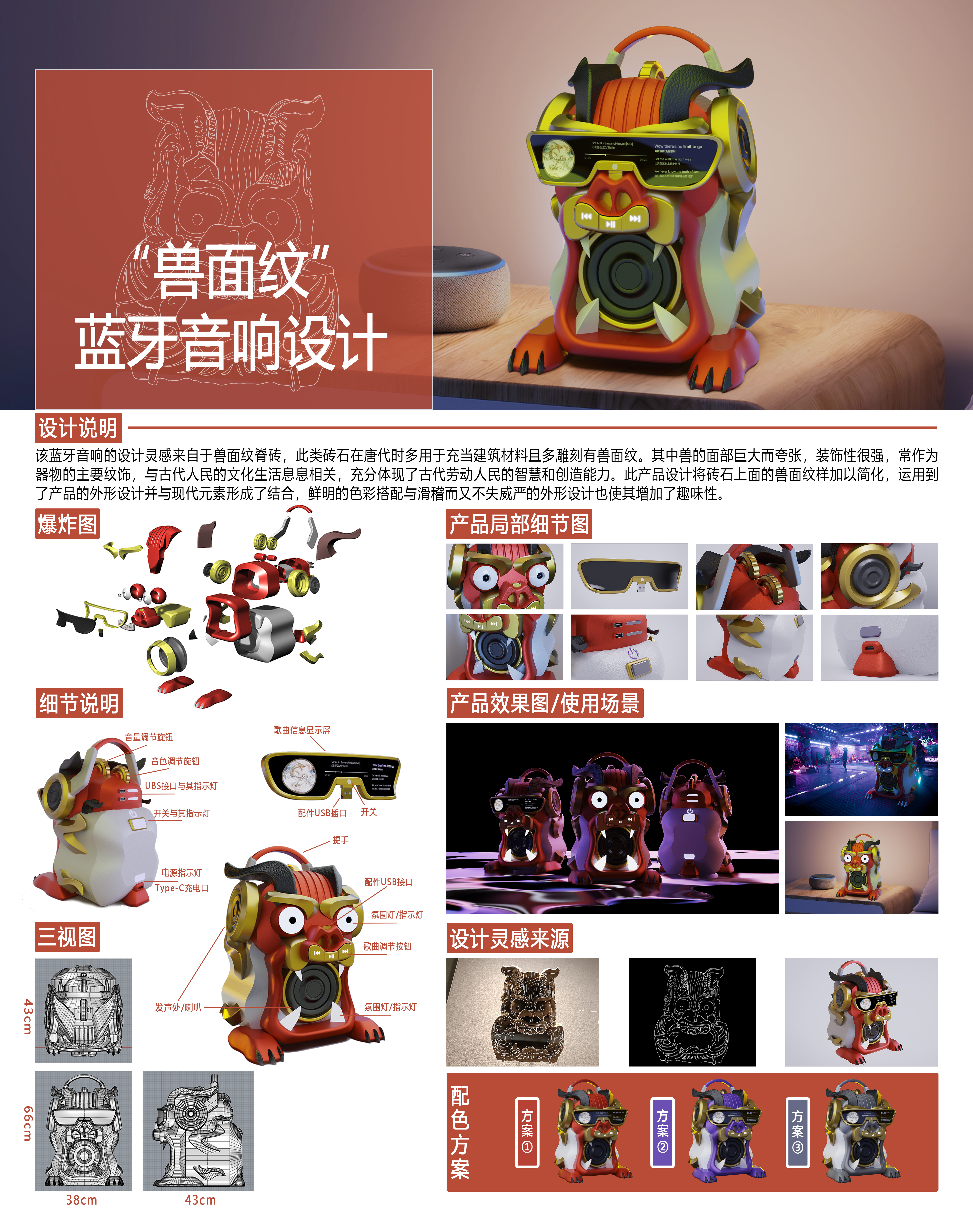 该蓝牙音响的设计灵感来自于兽面纹脊砖,此类砖石在唐代时多用于充当建筑材料且多雕刻有兽面纹。其中兽的面部巨大而夸张,装饰性很强,常作为器物的主要纹饰,与古代人民的文化生活息息相关,充分体现了古代劳动人民的智慧和创造能力。此产品设计将砖石上面的兽面纹样加以简化,运用到了产品的外形设计并与现代元素形成了结合,鲜明的色彩搭配与滑稽而又不失威严的外形设计也使其增加了趣味性。