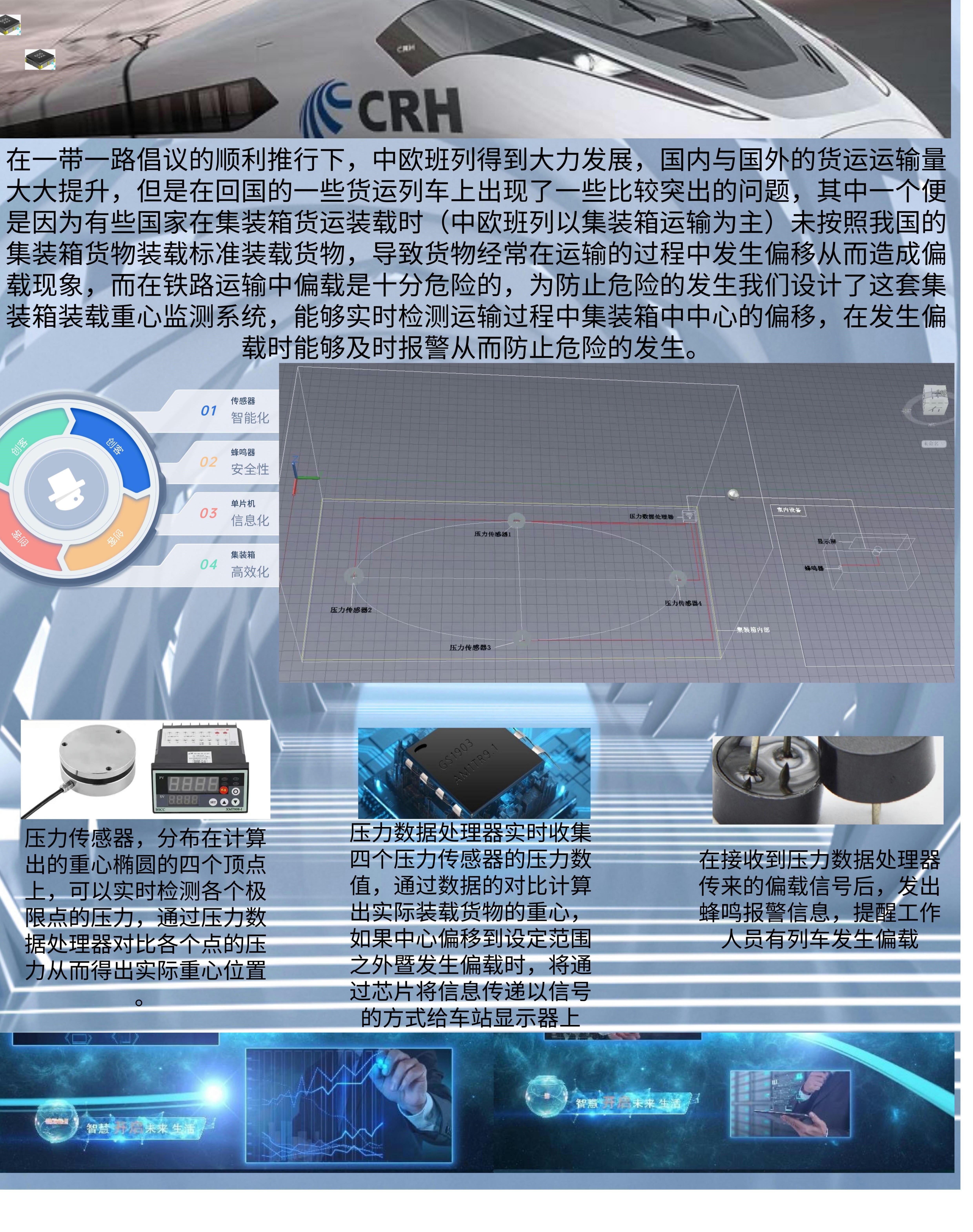 国内与国外的货运运输量大大提升,但是在回国的一些货运列车上出现了一些比较突出的问题,其中一个便是因为有些国家在集装箱货运装载时(中欧班列以集装箱运输为主)未按照我国的集装箱货物装载标准装载货物,而在铁路运输中偏载是十分危险的,为防止危险的发生我们设计了这套集装箱装载重心监测系统,能够实时检测运输过程中集装箱中中心的偏移,在发生偏载时能够及时报警从而防止危险的发生。