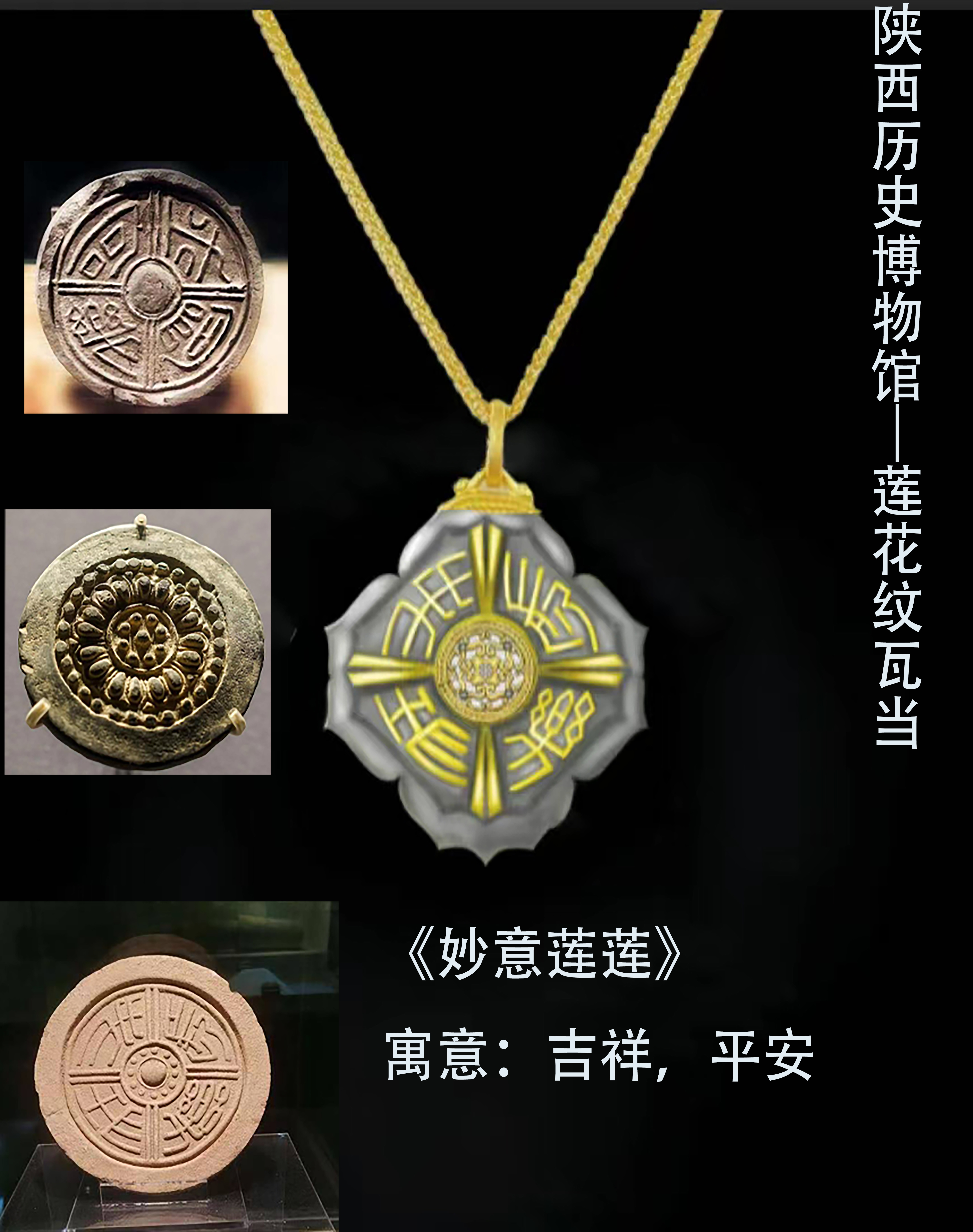 这款项链温柔典雅,低调中显现高雅。采用陕西历史博物馆里莲花纹瓦当里的花纹。莲花纹瓦当是佛教的标志,代表着"净土"与"纯洁",寓意"吉祥"。莲花纹饰形态饱满,纹饰线条近乎圆形的饱满弧线,再配以辅助装饰,使人感到生动、活泼、华丽、丰满、富贵,有浓郁的生活情趣与旺盛的生命力。