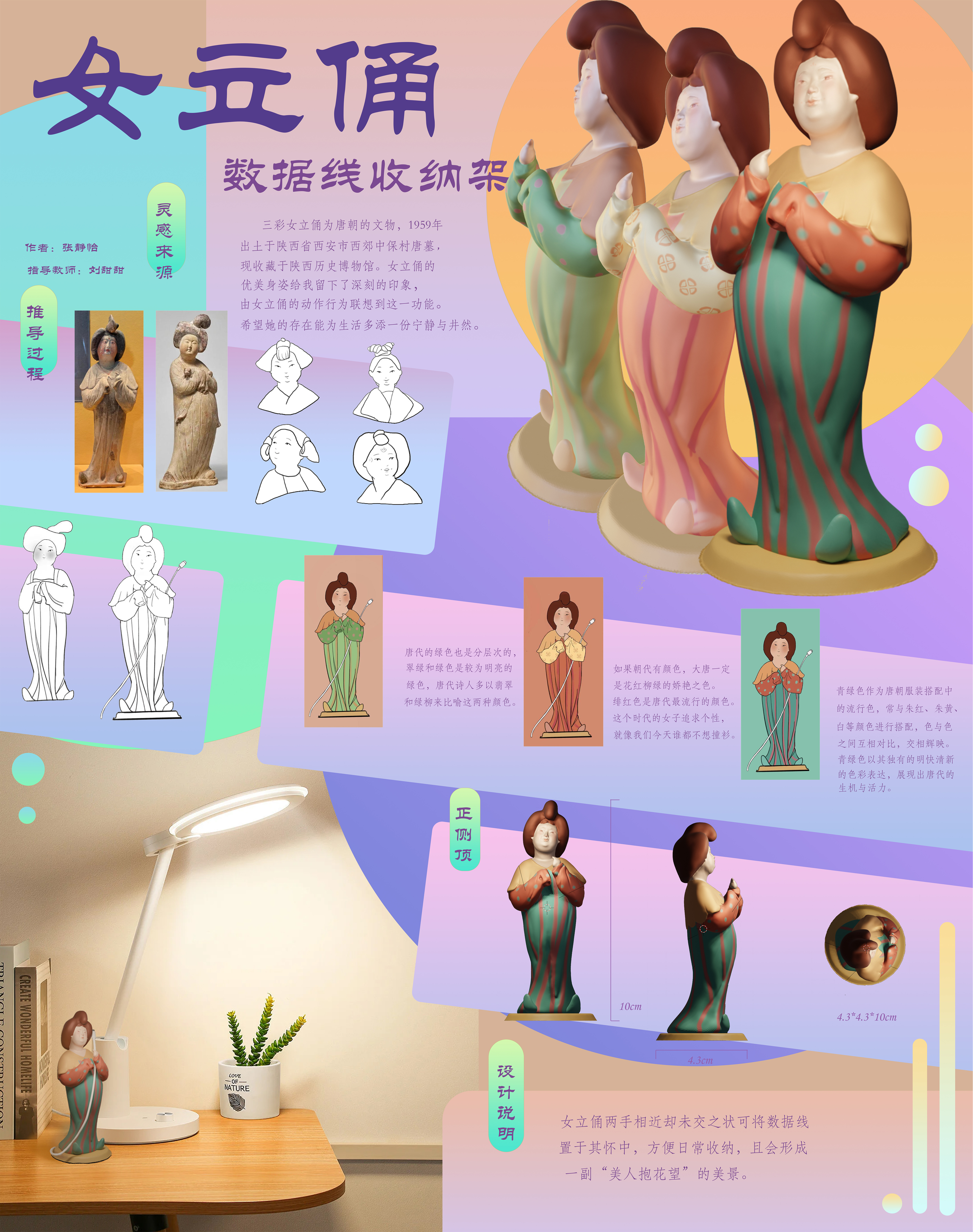 女立俑两手相近却未相交之状可将数据线置于其怀中,方便日常收纳,且会形成一幅“美人抱花望”的美景。