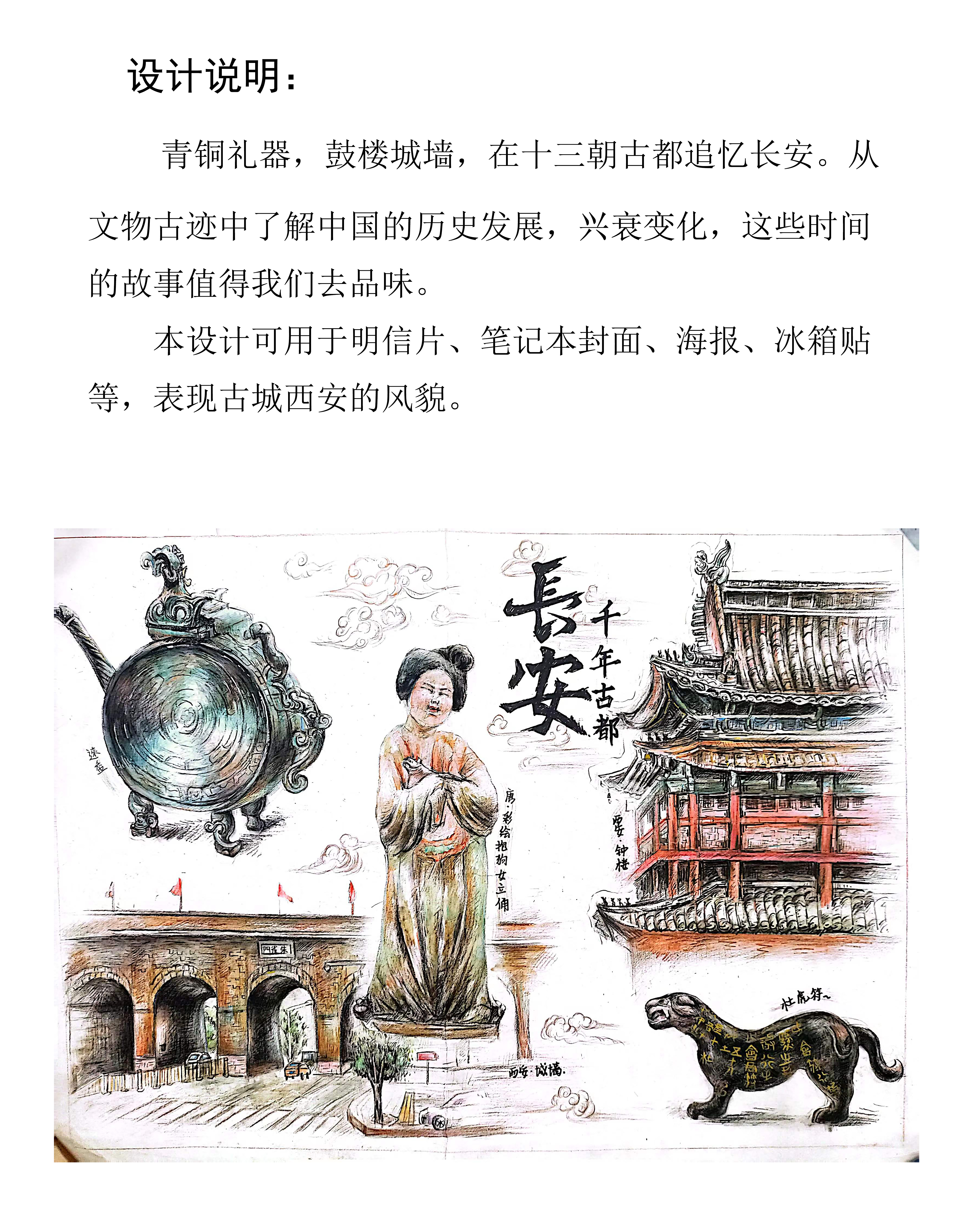 青铜礼器,鼓楼城墙……,在十三朝古都追忆长安。从文物古迹中了解中国的历史发展,兴衰变化,这些时间的故事值得我们去品味。 本设计可用于明信片、笔记本封面、海报、冰箱贴等,表现古城西安的风貌。