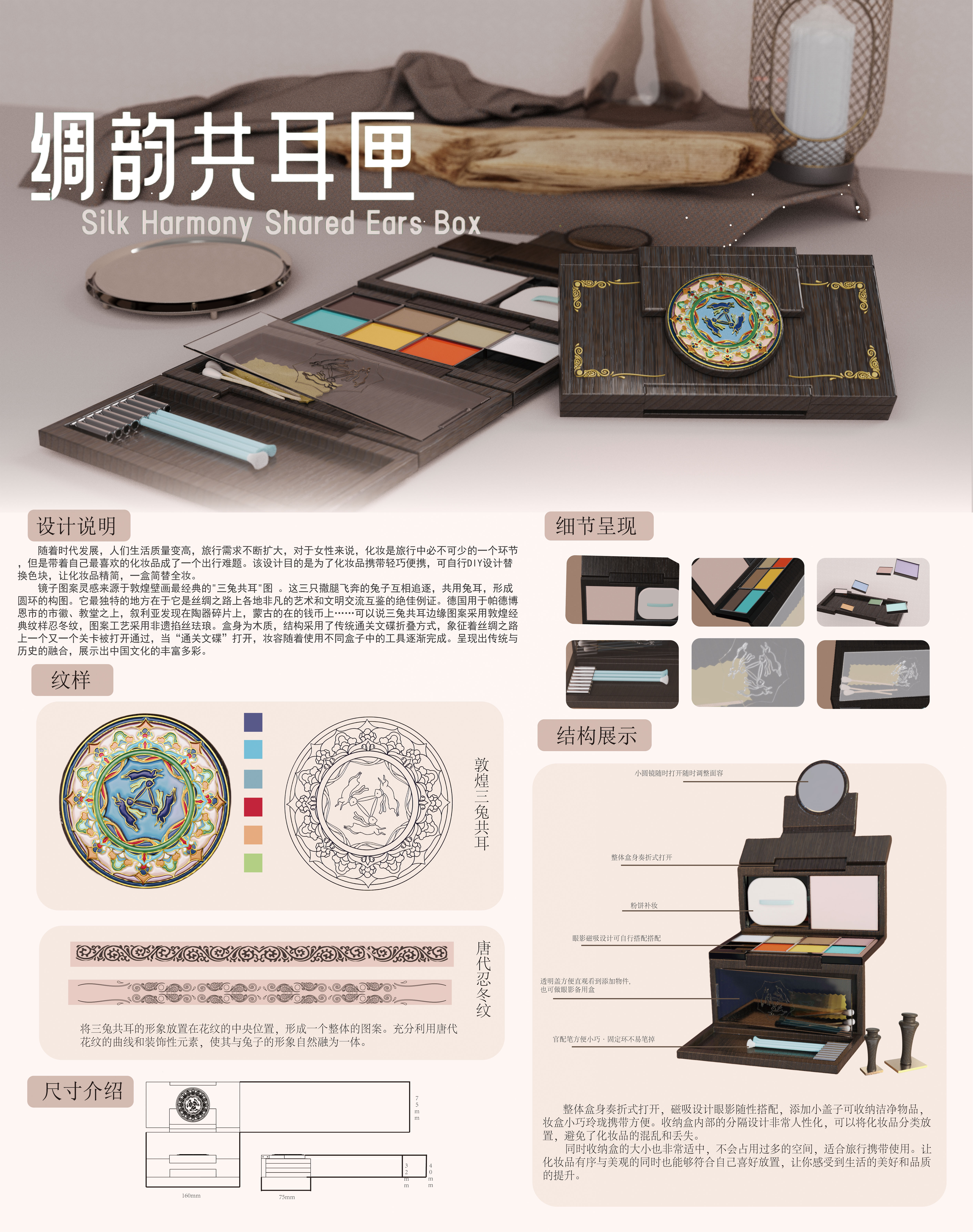 随着时代发展,人们生活质量变高,旅行需求不断扩大,对于女性来说,化妆是旅行中必不可少的一个环节。但是带着自己最喜欢的化妆品成了一个出行难题。该设计目的是为了化妆品携带轻巧便携,可自行DIY设计替换色块,让化妆品精简,一盒简替全妆。镜子图案灵感来源于敦煌壁画最经典的”三免共耳"图,呈现出传统与历史的融合,展示出中国文化的丰富多彩。