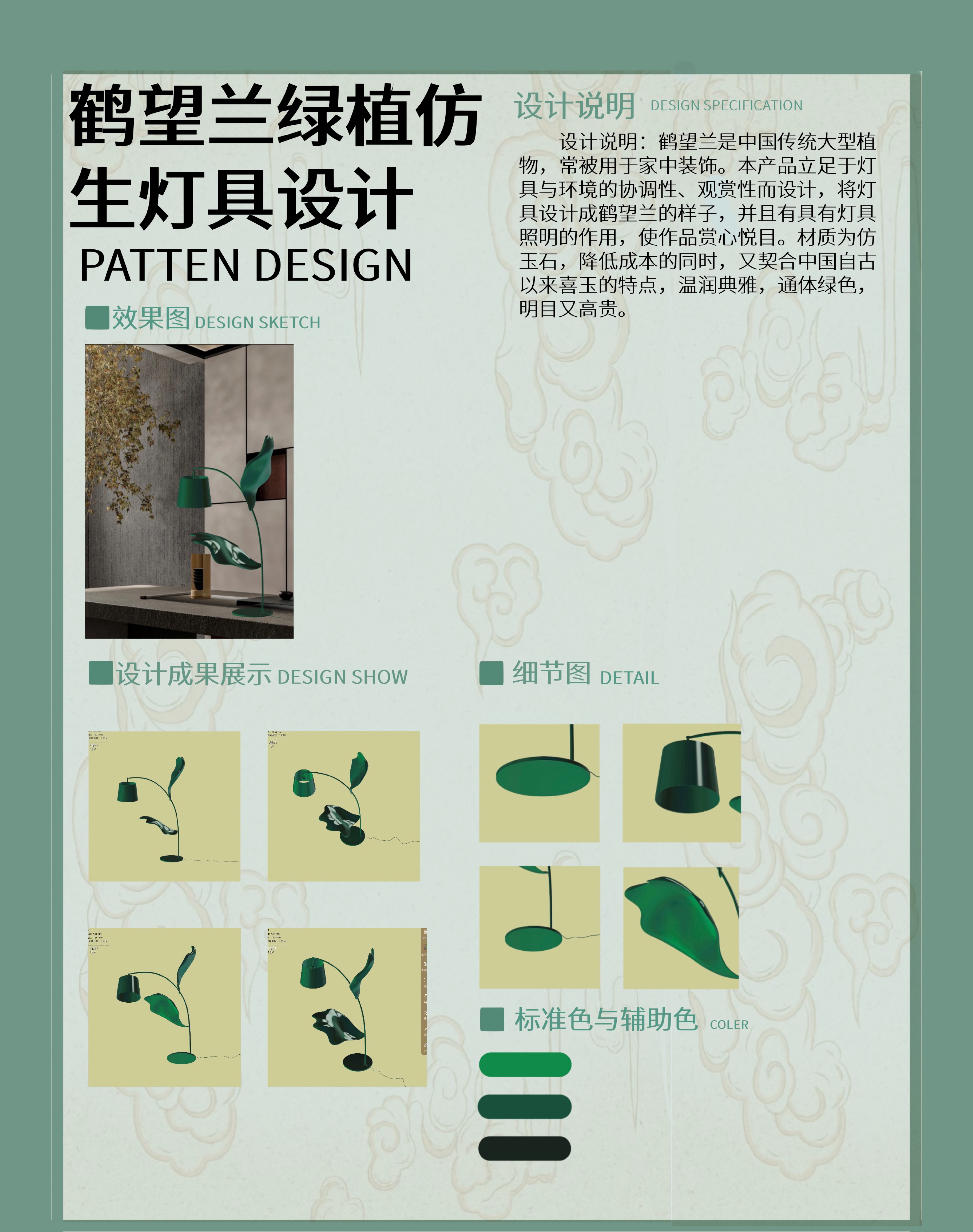 鹤望兰是中国传统大型植物,常被用于家中装饰。本产品立足于灯具与环境的协调性、观赏性而设计,将灯具设计成鹤望兰的样子,并且有具有灯具照明的作用,使作品赏心悦目。材质为仿玉石,降低成本的同时,又契合中国自古以来喜玉的特点,温润典雅,通体绿色,明目又高贵。