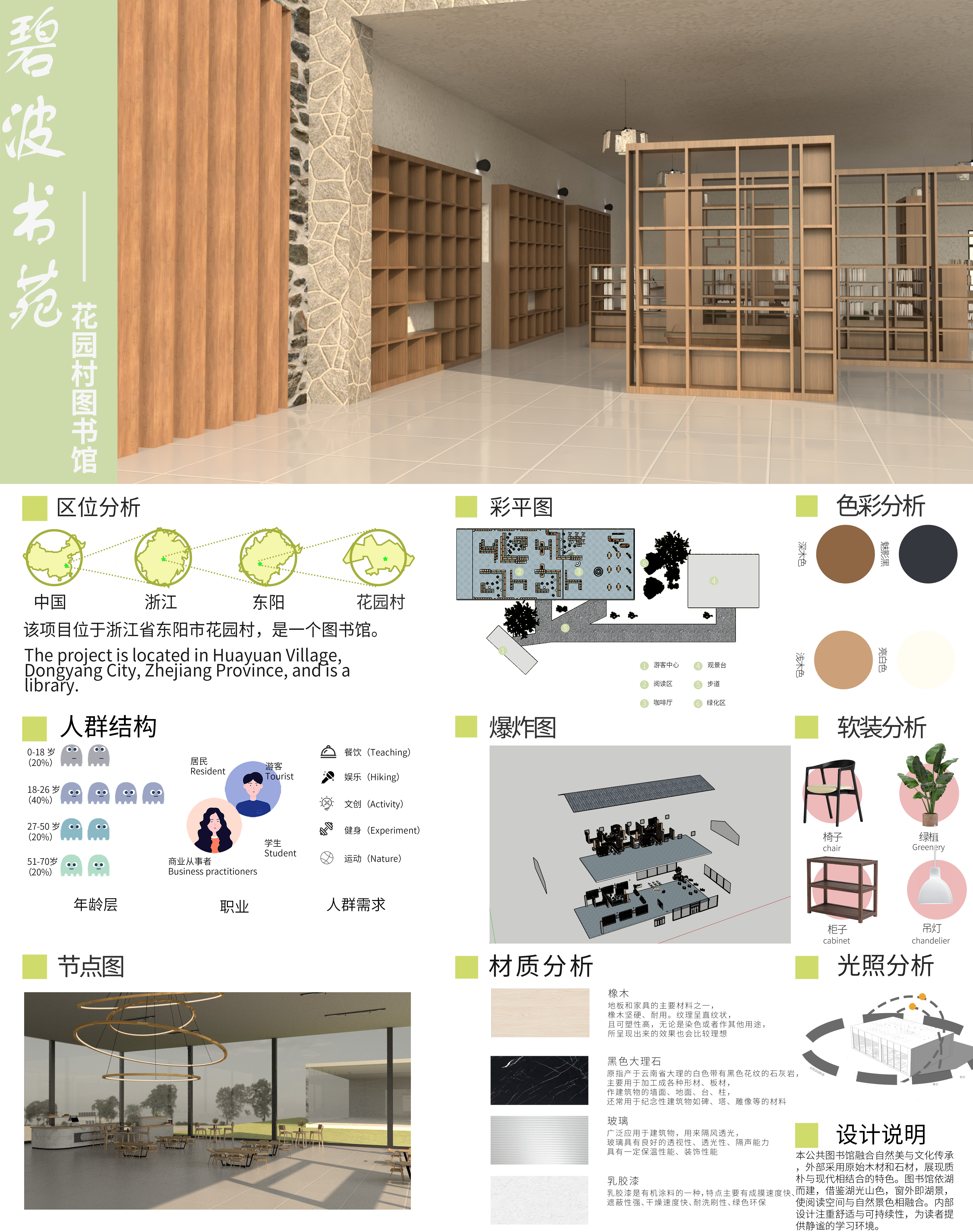 本公共图书馆融合自然美与文化传承,外部采用原始木材和石材,展现质朴与现代相结合的特色。图书馆依湖而建,借鉴湖光山色,窗外即湖景,使阅读空间与自然景色相融合。内部设计注重舒适与可持续性,为读者提供静谧的学习环境。