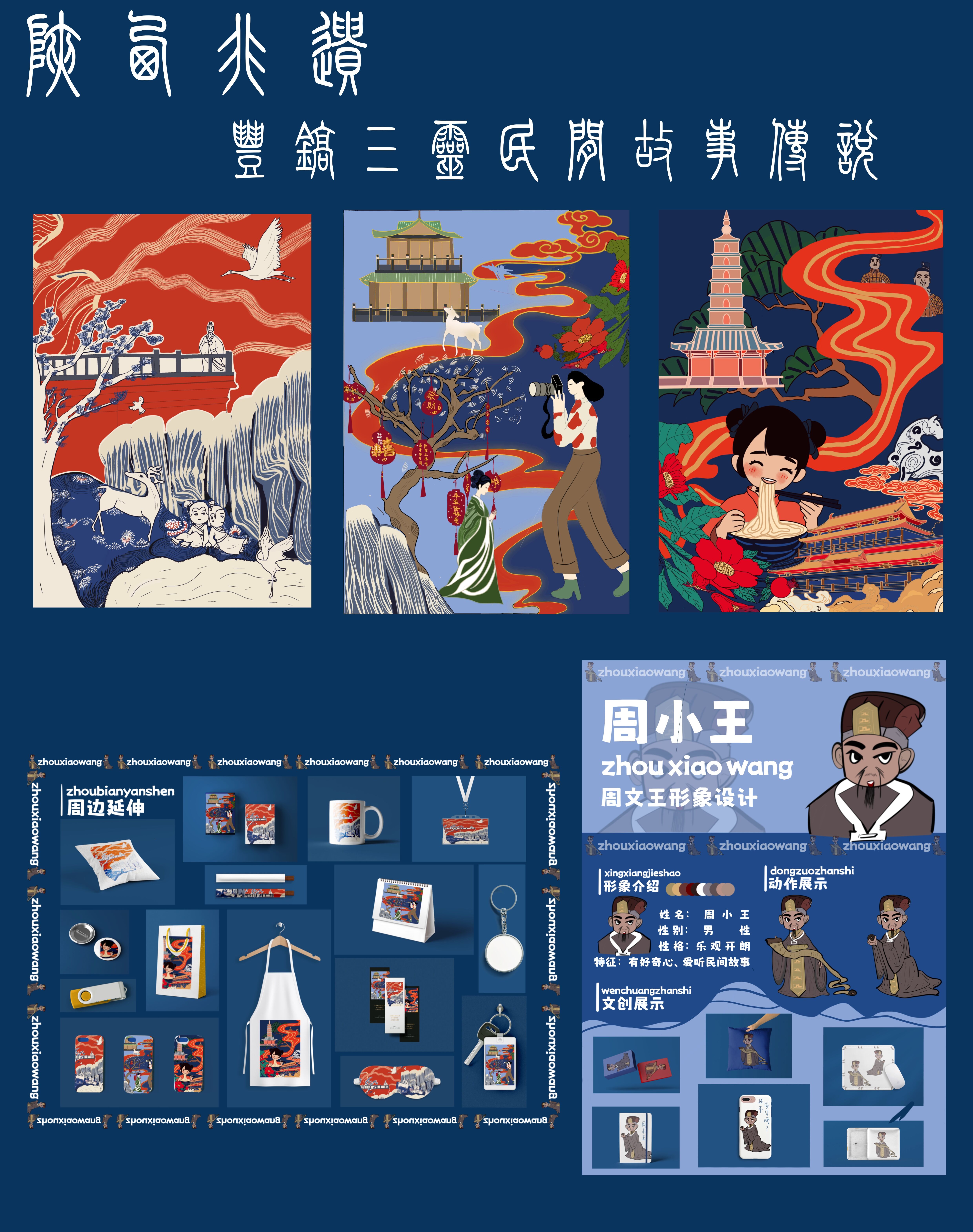 我们的设计思路是来自于陕西的传统非遗文化之丰镐三灵民间故事。我们选其三个故事作为灵感来源。三个故事中富有的人文情怀为我们提供了从古至今国泰民安,安宁生活,人与动物和谐共生这三个主题,为海报提供了相关的构图思路。海报的主题色调以白色、蓝色和红色为主,红色在传统文化中代表着幸福、祥和的寓意。而蓝色则代表着宽广、和谐的色彩,更加突出传统民间故事的韵味。