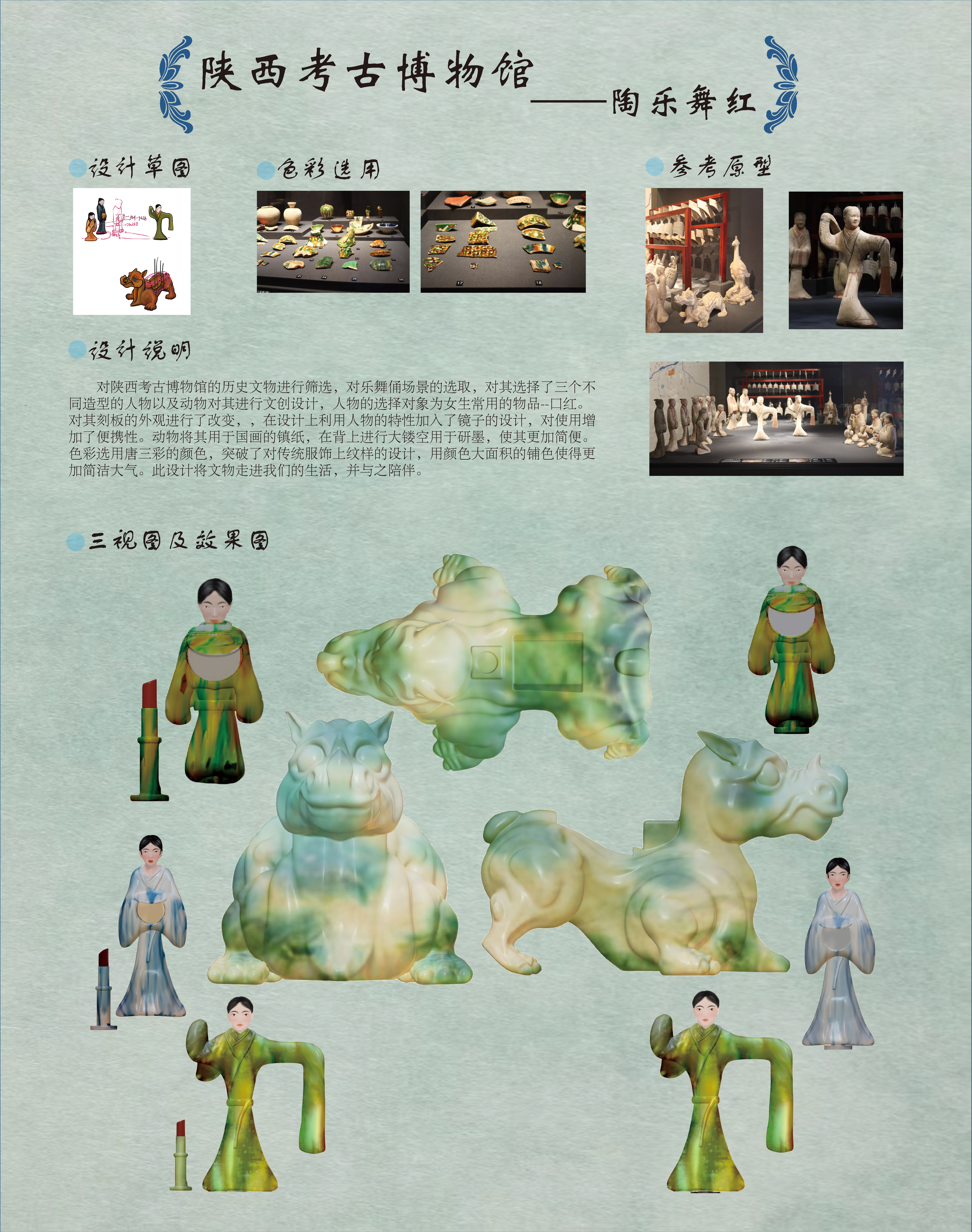对乐舞俑场景的选取,对其选择了三个不同造型的人物以及动物对其进行文创设计,人物的选择对象为女生常用的物品--口红。对其刻板的外观进行了改变,,在设计上利用人物的特性加入了镜子的设计,对使用增加了便携性。动物将其用于国画的镇纸,在背上进行大镂空用于研墨,使其更加简便。色彩选用唐三彩的颜色,突破了对传统服饰上纹样的设计,用颜色大面积的铺色使得更加简洁大气。此设计将文物走进我们的生活,并与之陪伴。
