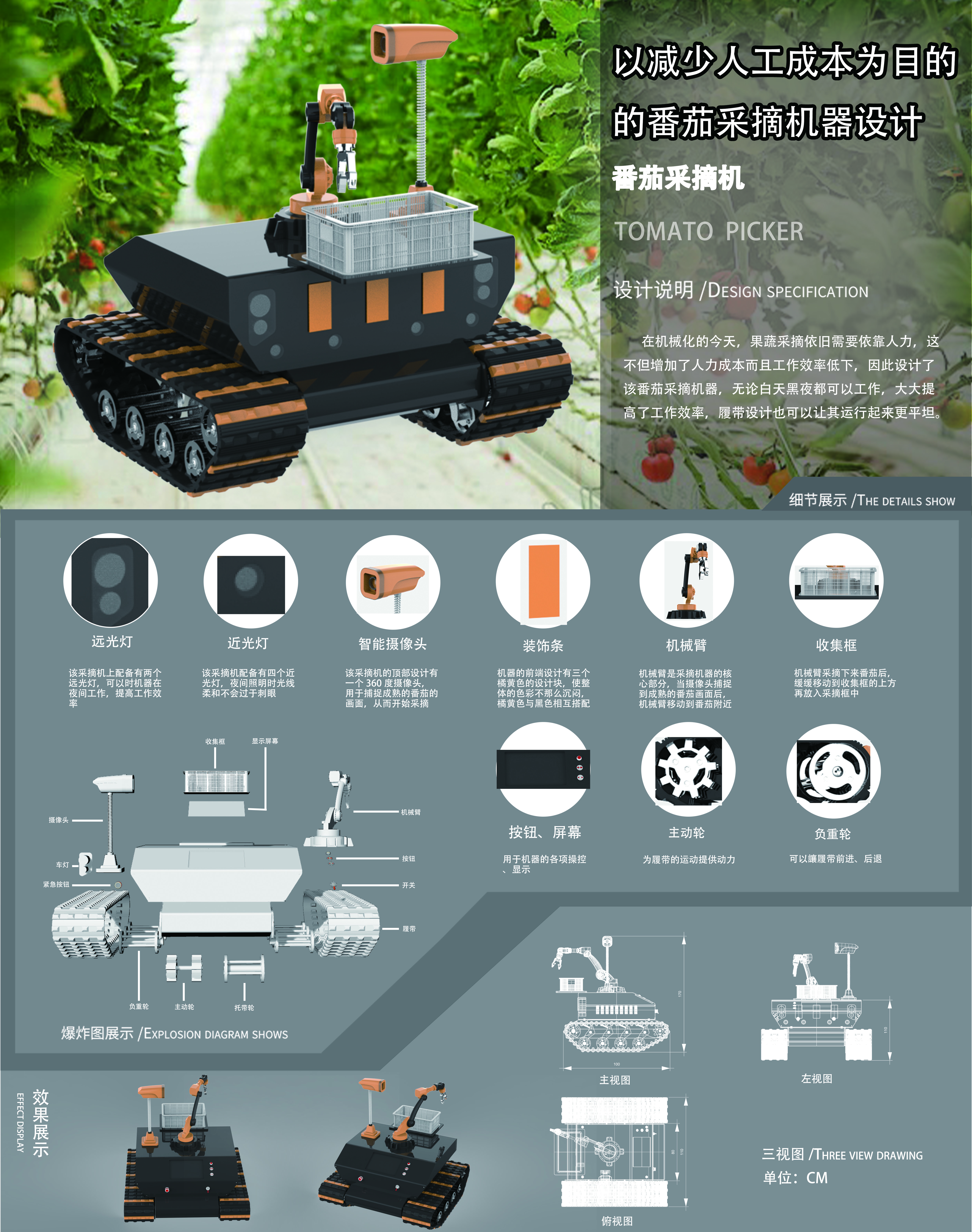 这是一款采摘番茄的智能机器车,主要包括采摘机械臂、检测摄像、智能屏幕、采摘篮、履带等,整体采用黑橙配色,稳重又带有活力。番茄采摘车进入番茄园后,通过摄像头检测番茄位置,并在智能屏幕呈现番茄位置状态与行驶路线,机械臂通过轴承转动使爪部结构采摘番茄并放入采摘篮内并计数,完成采摘步骤。智能采摘有效的减缓了劳动人员的疲劳程度,用更智能化、便捷化的方式实现无人驾驶与无人采摘。