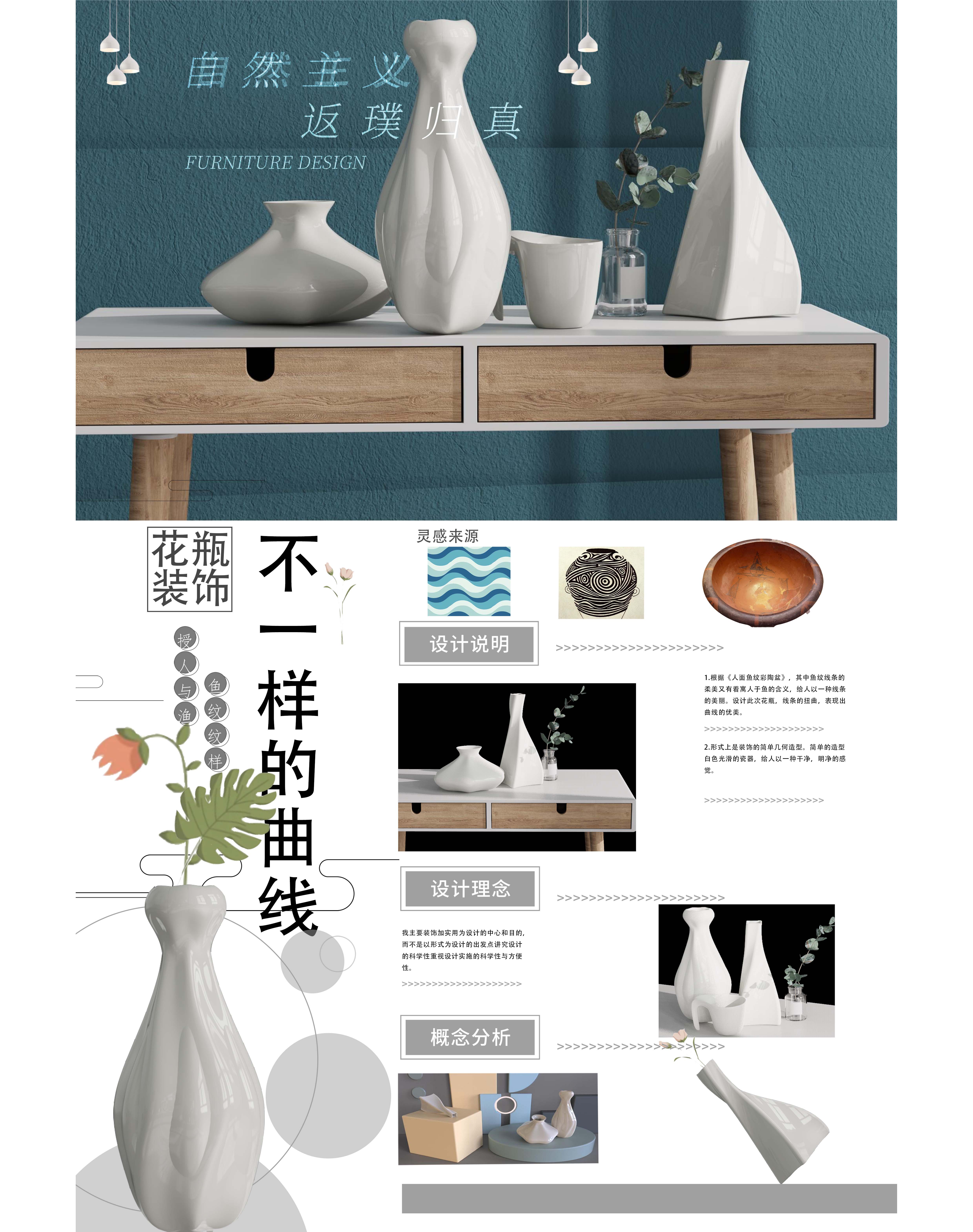 1.根据《人面鱼纹彩陶盆》,其中鱼纹线条的柔美,又有着寓人于鱼的含义,给人以一种线条的美丽。设计此次花瓶,充分表现出曲线优美。2.形式上是装饰的简单几何造型。简单的造型白色光滑的瓷器,给人以一种干净,明净的感觉。