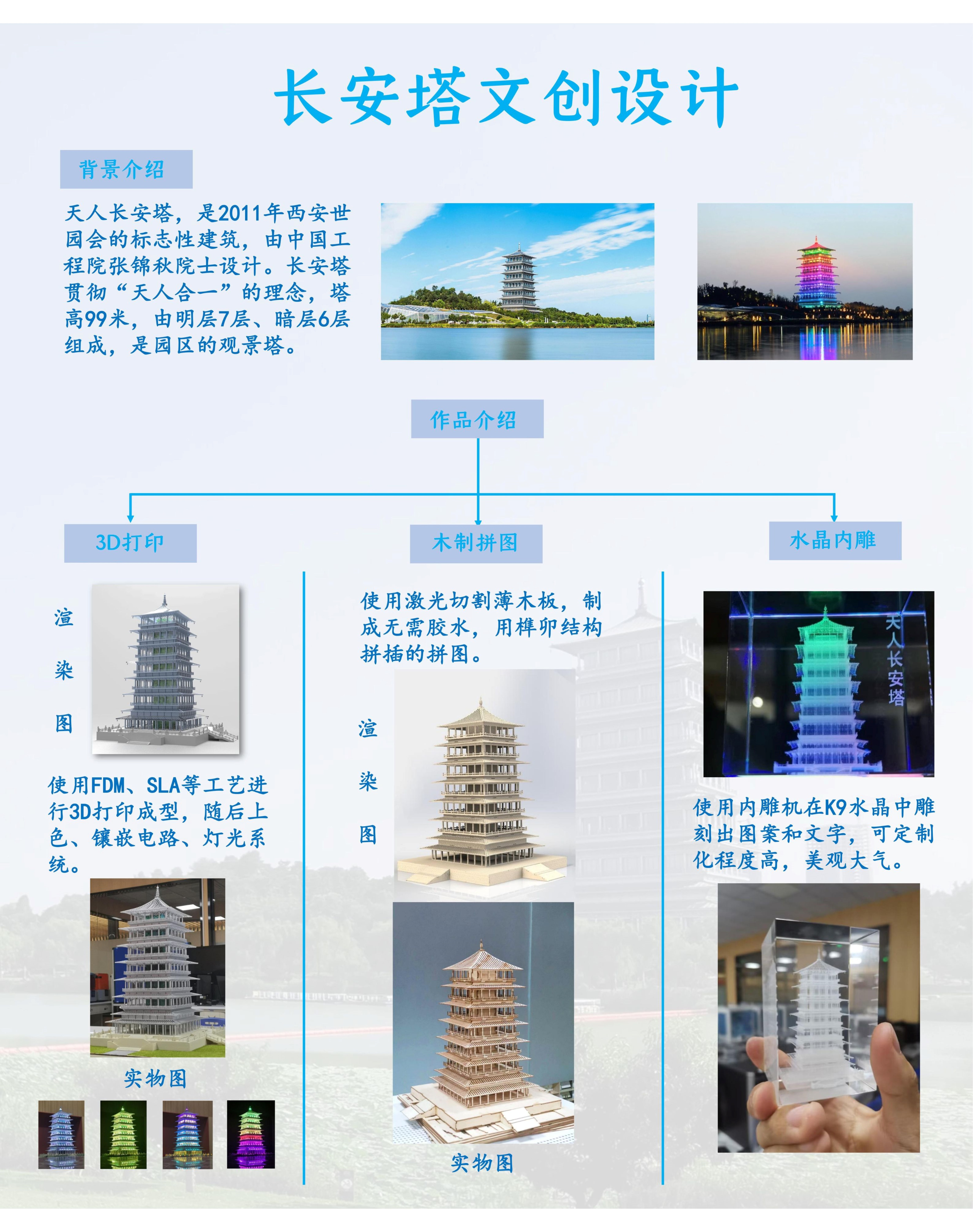 以长安塔为元素符号创作文创,分别为3D打印模型款、木制立体拼图款、水晶激光内雕款