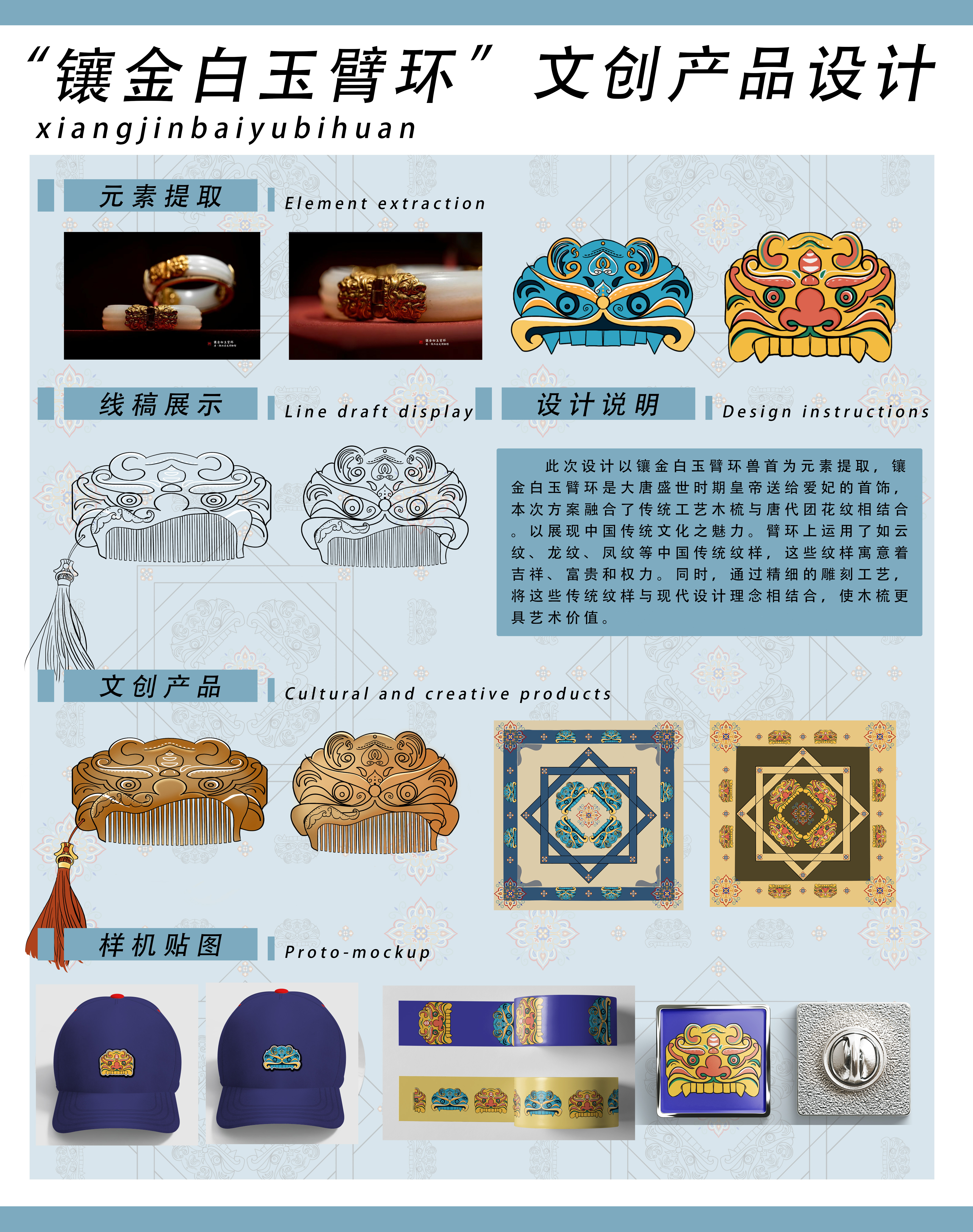 此次设计以镶金白玉臂环兽首为元素提取,镶金白玉臂环是大唐盛世时期皇帝送给爱妃的首饰,本次方案融合了传统工艺木梳与唐代团花纹相结合。以展现中国传统文化之魅力。臂环上运用了如云纹、龙纹、凤纹等中国传统纹样,这些纹样寓意着吉祥、富贵和权力。同时,通过精细的雕刻工艺,将这些传统纹样与现代设计理念相结合,使木梳更具艺术价值。
