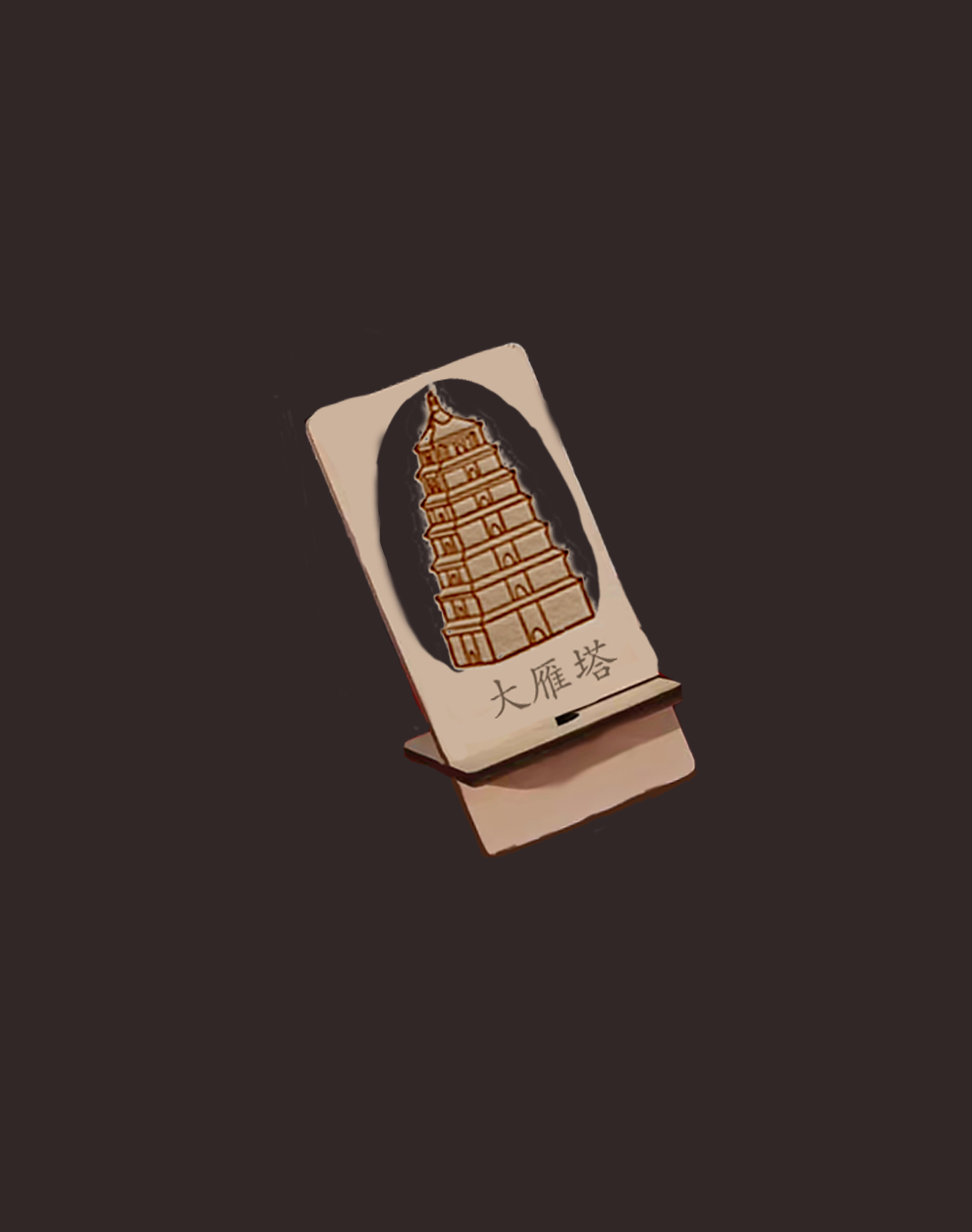这个作品运用了陕西的传统文化,大雁塔与手机支架相结合。制作了一个木雕镂空的大雁塔手机支架。同时在设计的时候也可以加入其他的各种建筑,从而做成一个系列。可以在景点的周边一些传统文化的宣传,可以加强旅客对陕西传统文化的了解。