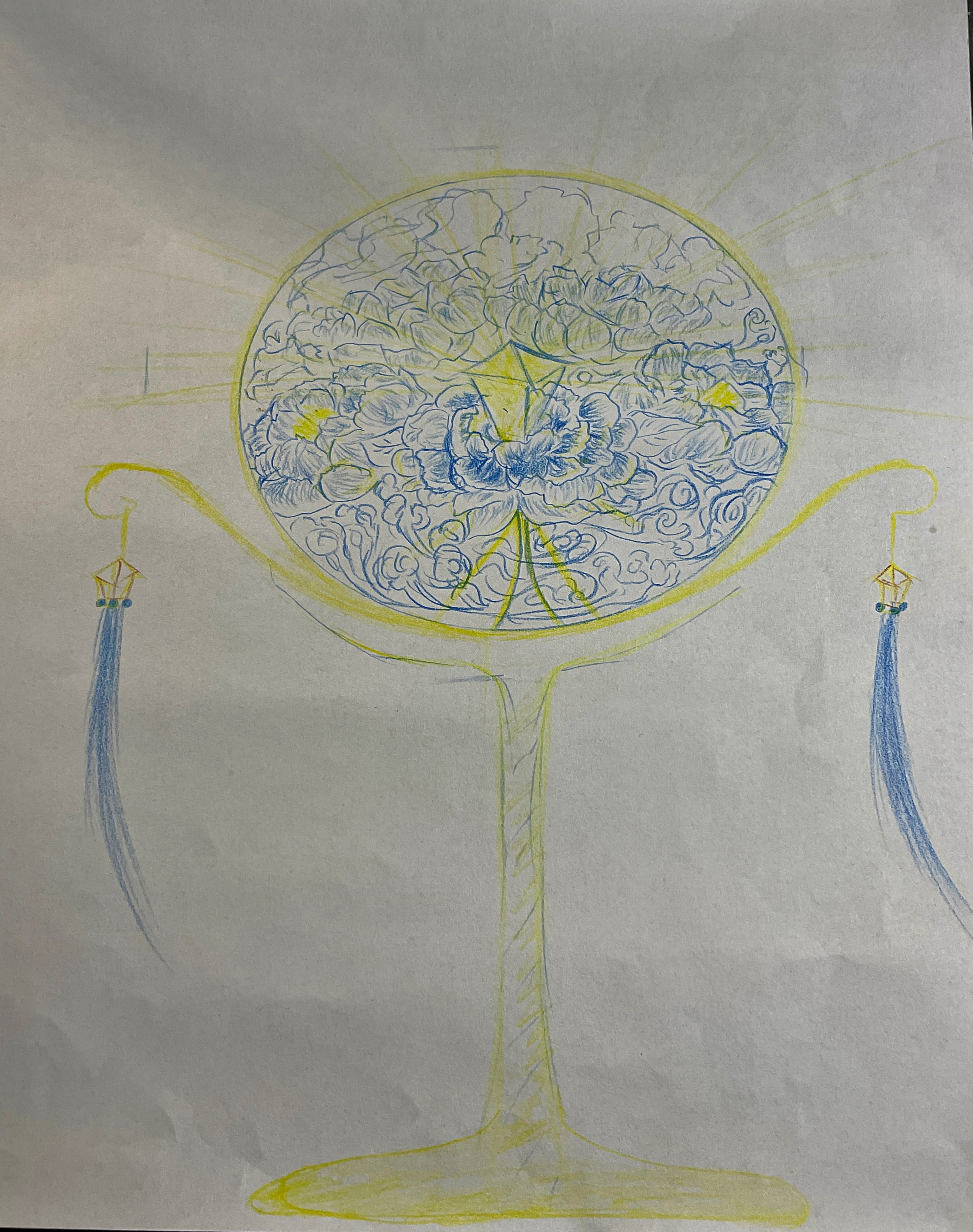 一款以牡丹花和祥云为主体的智慧出行景观灯,该灯外壳为镂空,发热出金黄色光芒,在白天是一个标志性建筑物,在晚上不仅是标志性建筑物,也是方向标,为我指引方向。