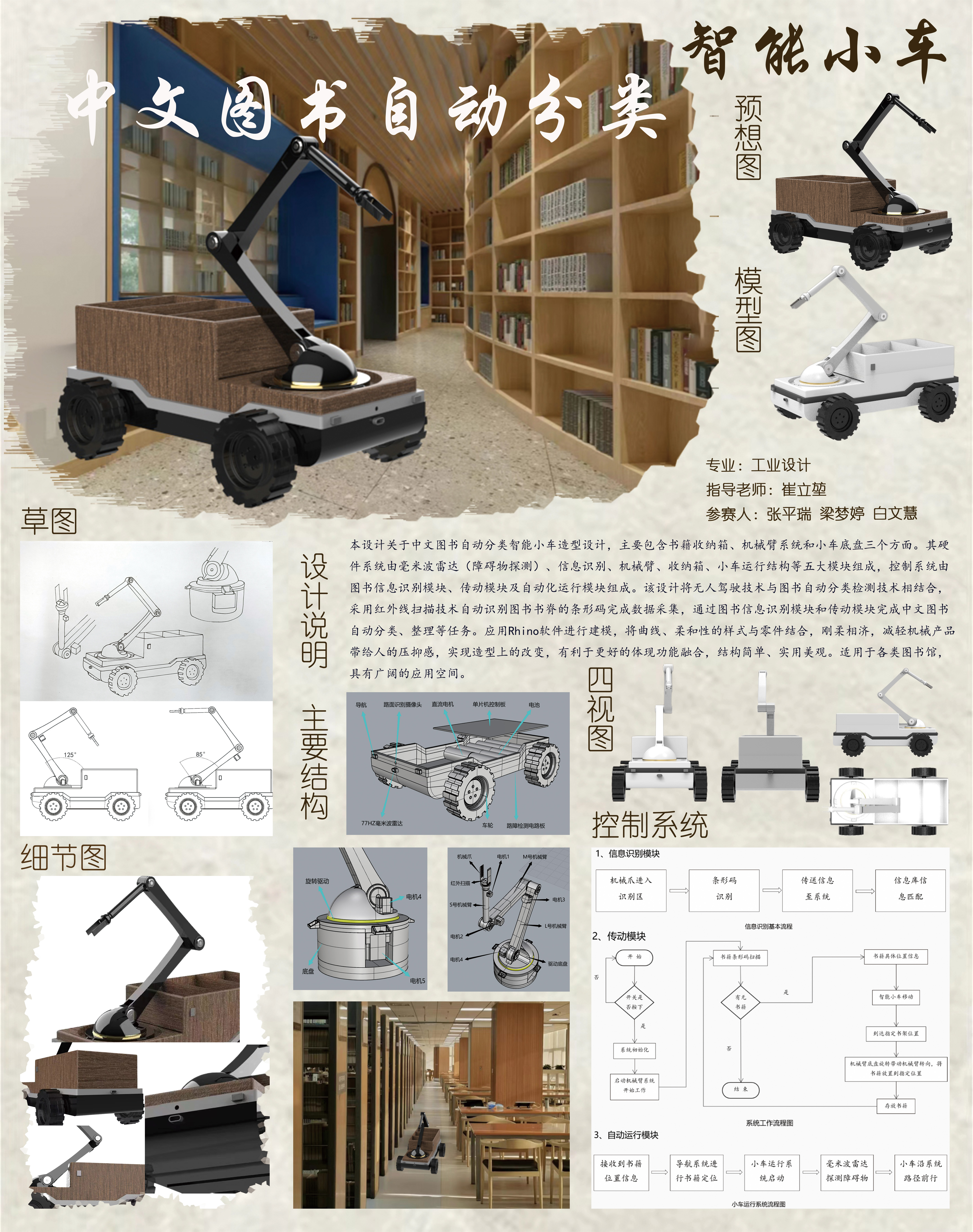 本设计关于中文图书自动分类智能小车造型设计,主要包含书籍收纳箱、机械臂系统和小车底盘三个方面。该设计将无人驾驶技术与图书自动分类检测技术相结合,采用红外线扫描技术自动识别图书书脊的条形码完成数据采集,通过图书信息识别模块和传动模块完成中文图书自动分类、整理等任务。将曲线、柔和性的样式与零件结合,刚柔相济,减轻机械产品带给人的压抑感,实现造型上的改变,有利于更好的体现功能融合,结构简单、实用美观。