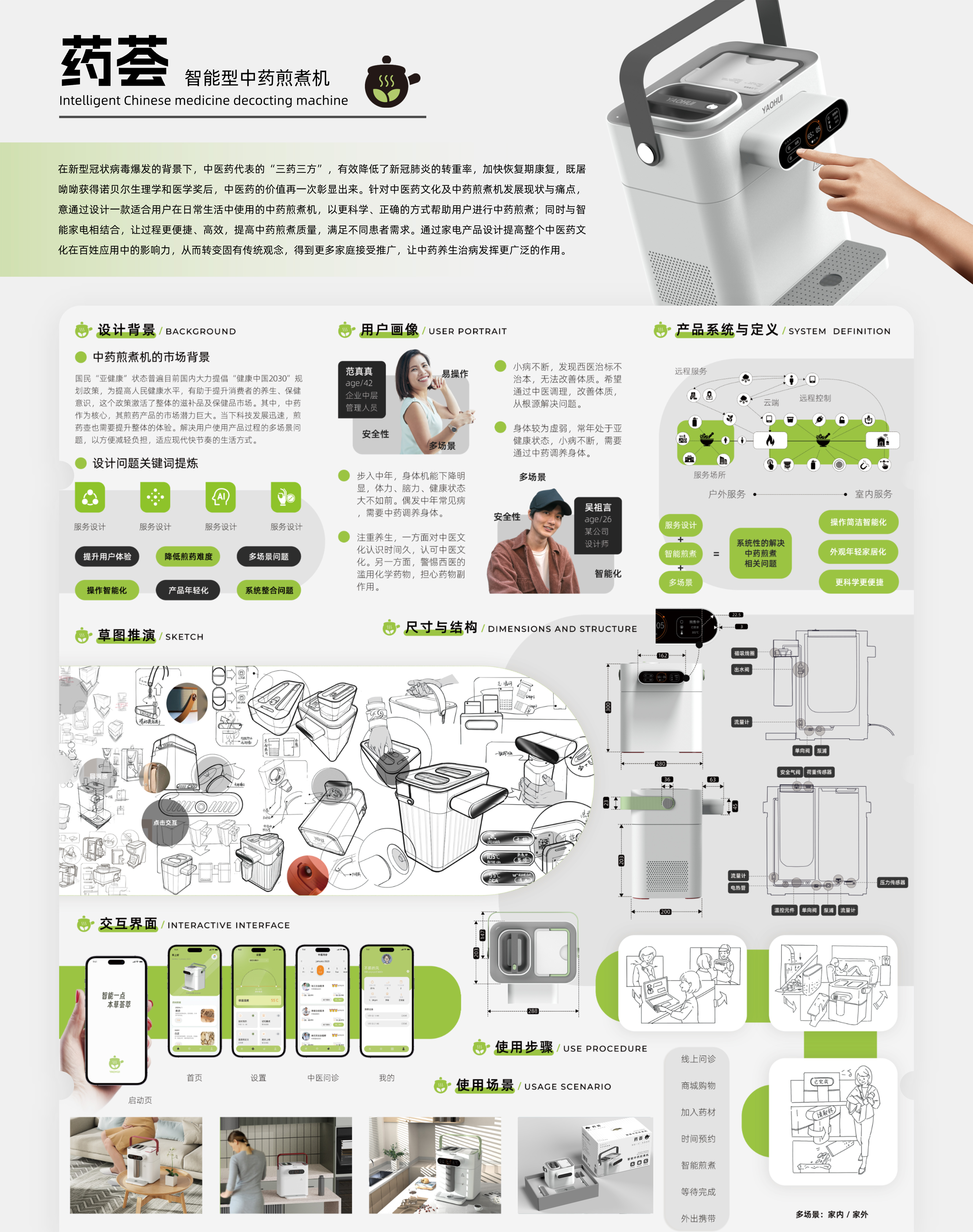 中医药代表的“三药三方”有效降低了新冠肺炎的转重率,既屠呦呦获得诺贝尔生理学和医学奖后,中医药的价值再一次彰显出来。针对中医药文化及中药煎煮机发展现状与痛点,意通过设计一款适合在日常生活中使用的中药煎煮机,以更科学的方式帮助用户进行中药煎煮,让过程更便捷、高效,提高中药煎煮质量,满足不同需求。通过这一设计提高整个中医药文化在百姓应用中的影响力,得到更多家庭接受推广,让中药养生治病发挥更广泛的作用。