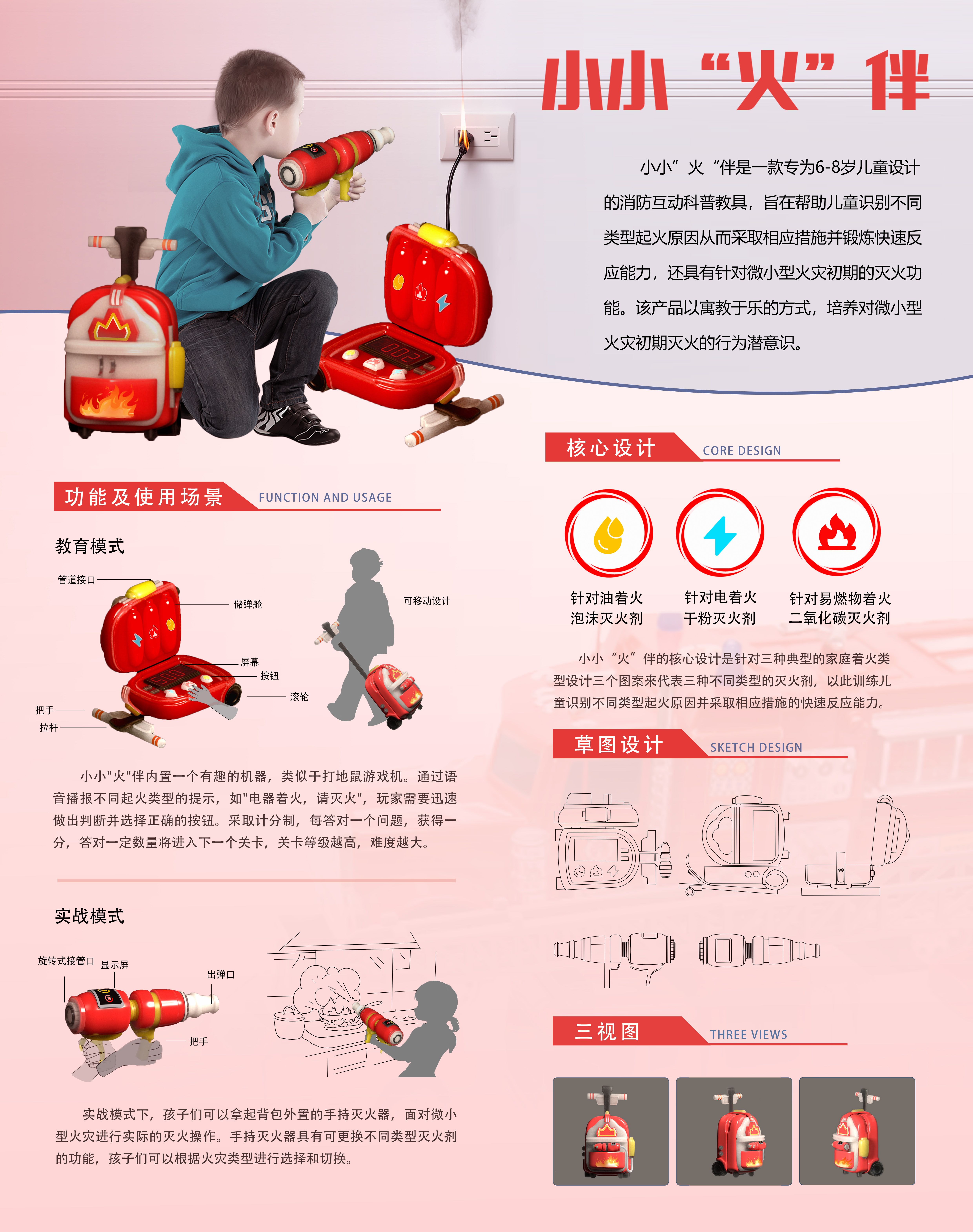 小小”火“伴是一款专为6-8岁儿童设计的消防互动科普教具,旨在帮助儿童识别不同类型起火原因从而采取相应措施并锻炼快速反应能力,还具有针对微小型火灾初期的灭火功能,帮助孩子们在第一时间控制火源扩散。该产品以寓教于乐的方式,让孩子们能够在游戏中学习并增长知识,从而培养孩子们对微小型火灾初期灭火的行为潜意识。让孩子们能够更好地理解火灾的危害、掌握基本消防知识,懂得如何在紧急情况下正确而快速地应对火灾。