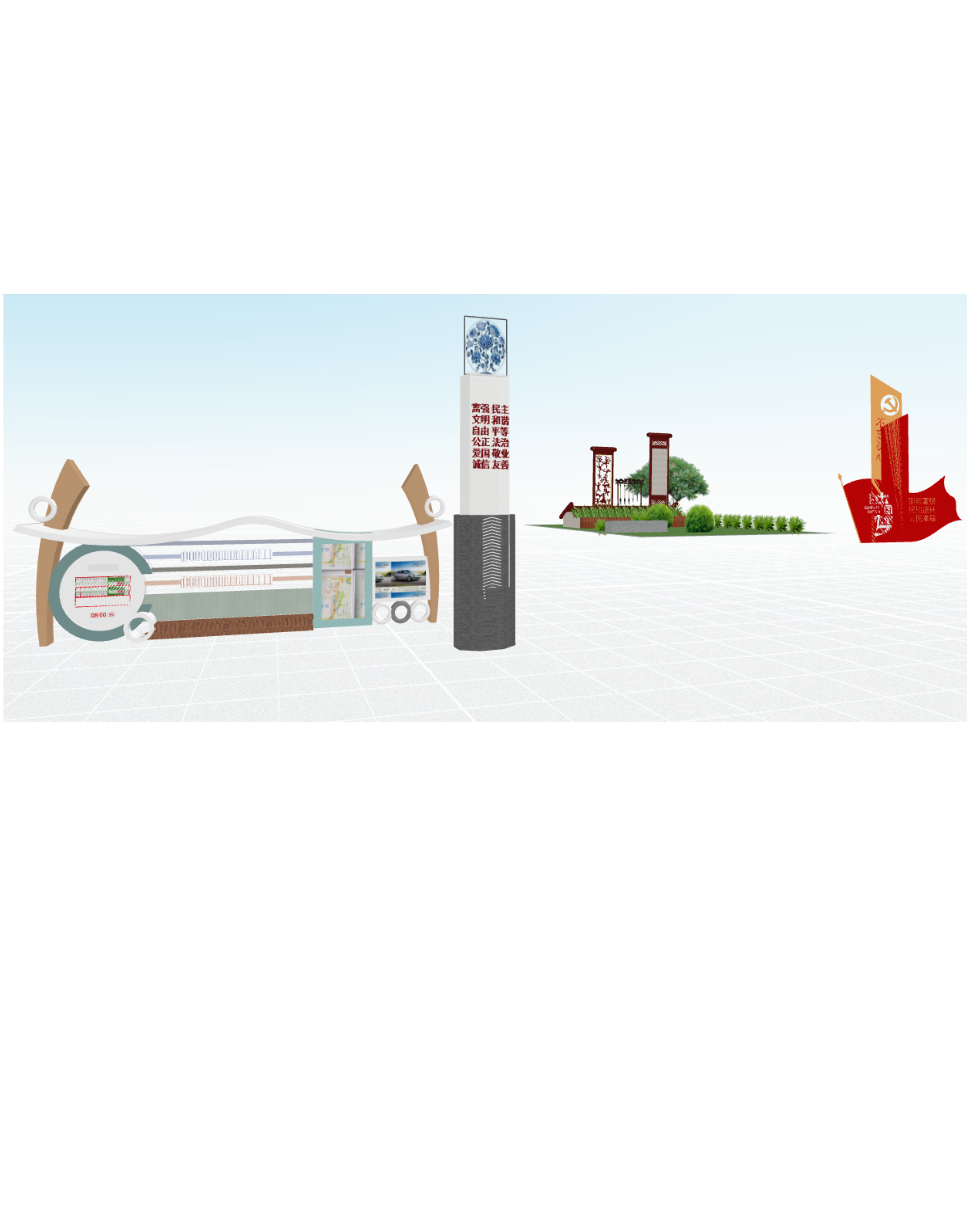 智慧出行公交站牌+以祥云和牡丹花为主题的景观灯