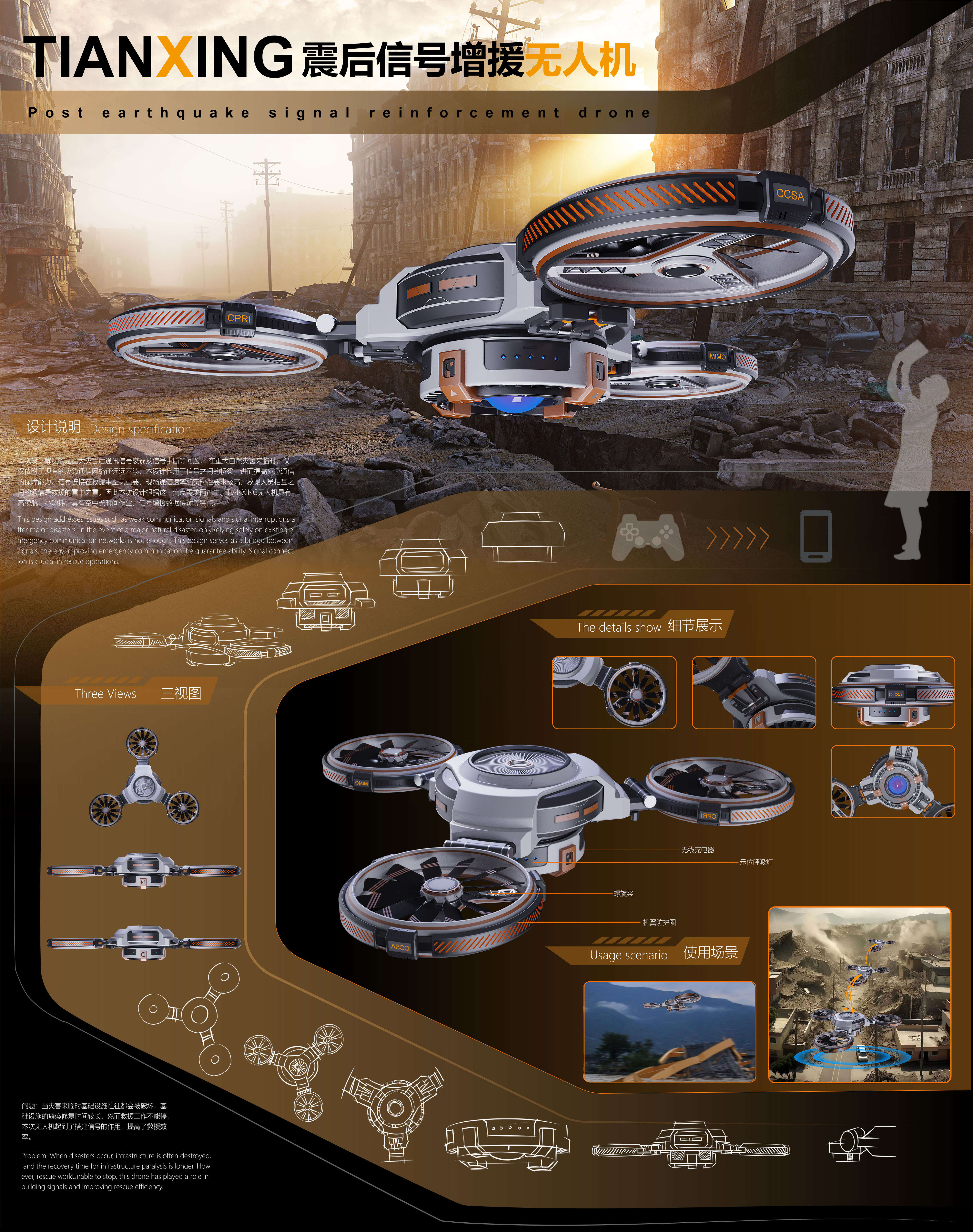 本次设计解决的是重大灾害后通讯信号衰弱及信号中断等问题,在重大自然灾害来临时,仅仅依附于现有的应急通信网络还远远不够,本设计作用于信号之间的桥梁,进而提高应急通信的保障能力。信号连接在救援中至关重要,现场通信速率和实时性要求极高,救援人员相互之间的通信是救援的重中之重。因此本次设计根据这一痛点需求而产生。TIANXING无人机具有高续航,小功耗,具有空中长时间作业、信号增援数据传输等特点。