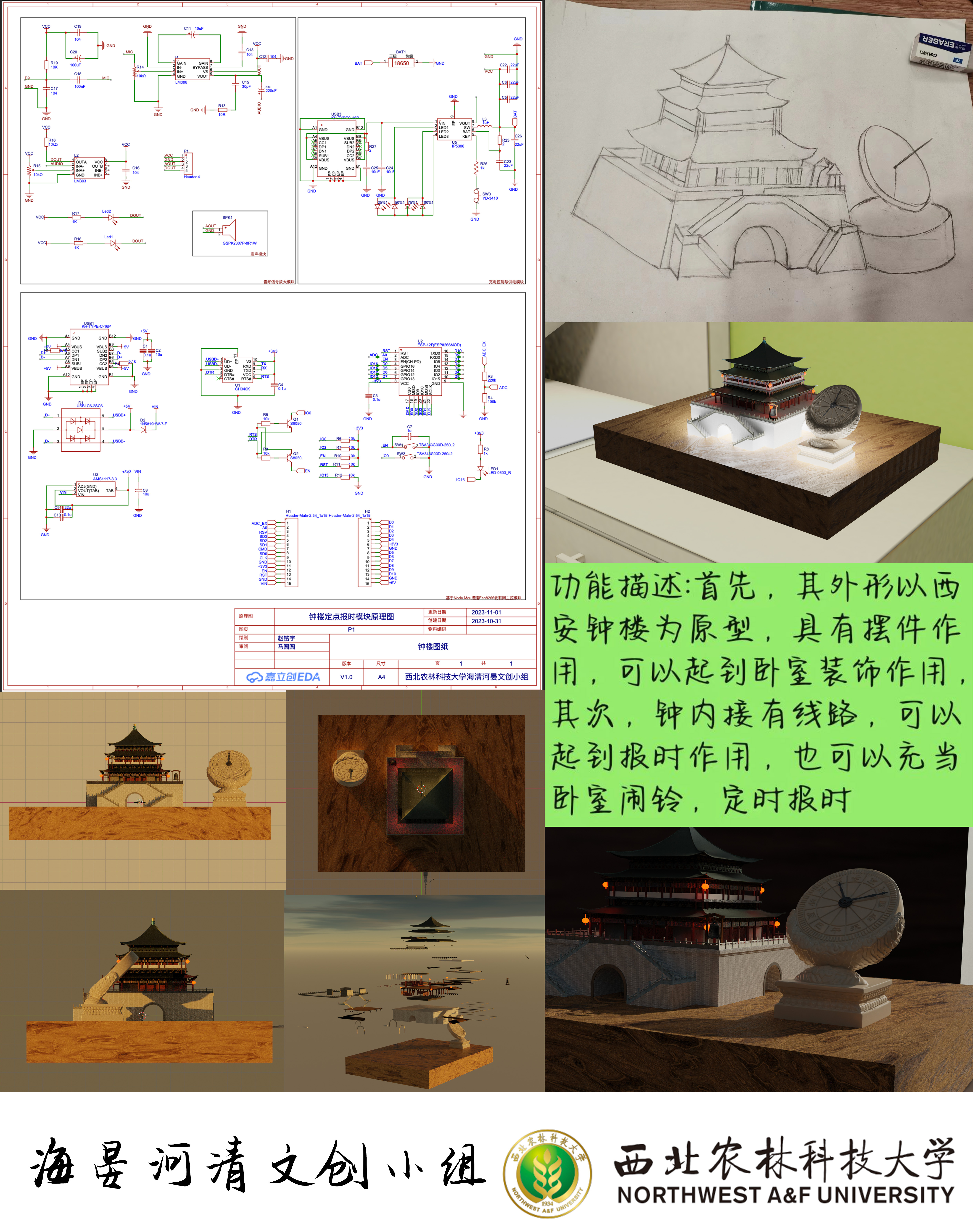 本钟以西安钟楼为主体形象,在其侧方设置日晷,我们采用了简约设计,保留西安钟楼的大部分特征,外观雅致大气,除观赏作用,雍鸣钟钟楼内部设有电路,具备重复闹钟功能,可以设置闹钟的重复模式:每天重复、工作日重复或自定义重复等,准确播报时间,《诗经·邶风·匏有苦叶》中写道“雍雍鸣雁,旭日始旦。“雍”象征温文尔雅、从容不迫。晨曦之时传来大雁叫声代表着我们充满希望,有着无限美好的未来。