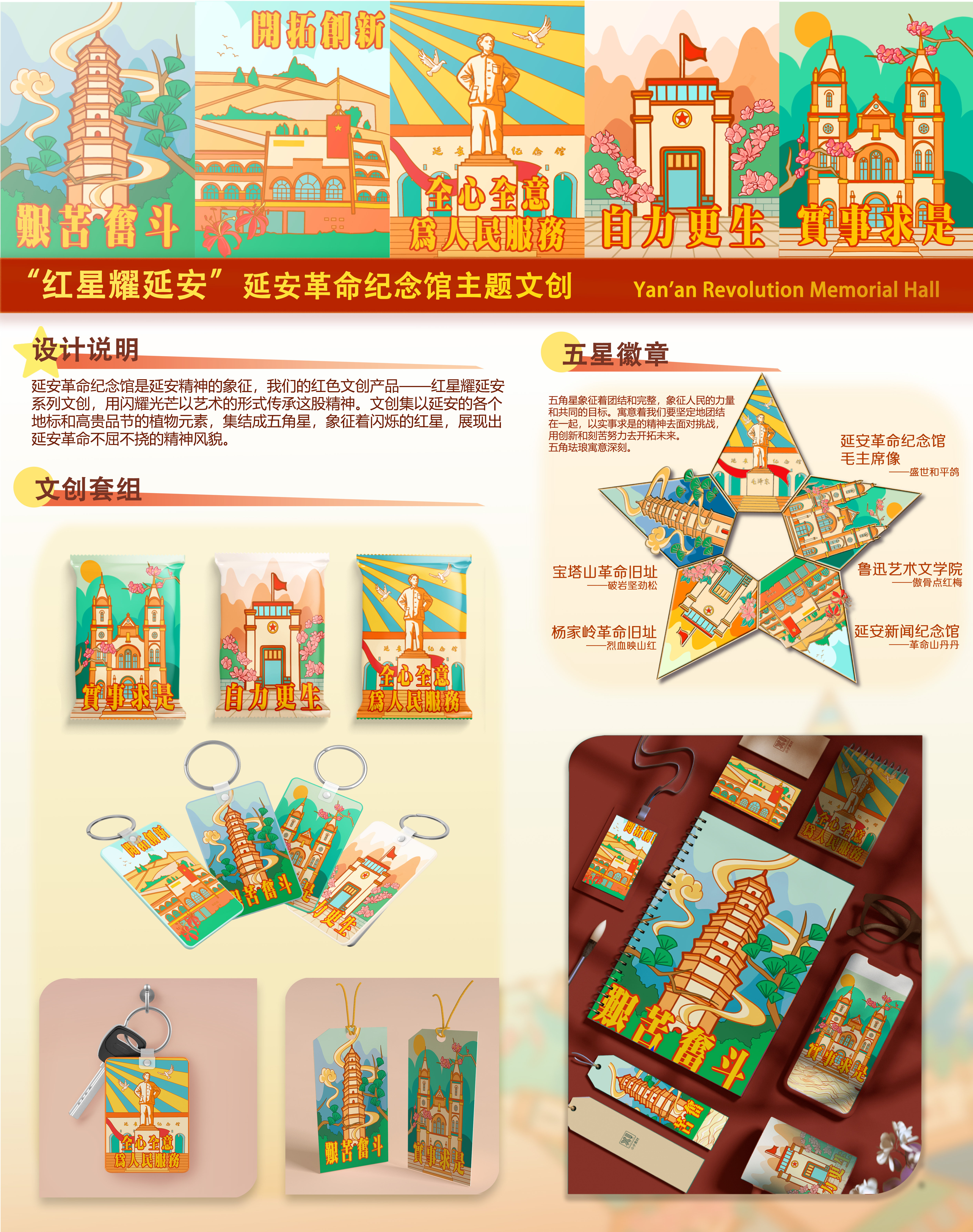 延安革命纪念馆是延安精神的象征,我们的红色文创产品——红星耀延安系列文创,用闪耀光芒以艺术的形式传承这股精神。文创集以延安的各个地标和高贵品节的植物元素,集结成五角星,象征着闪烁的红星,展现出延安革命不屈不挠的精神风貌。五角星象征着团结和完整,象征人民的力量和共同的目标。寓意着我们要坚定地团结在一起,以实事求是的精神去面对挑战,用创新和刻苦努力去开拓未来。