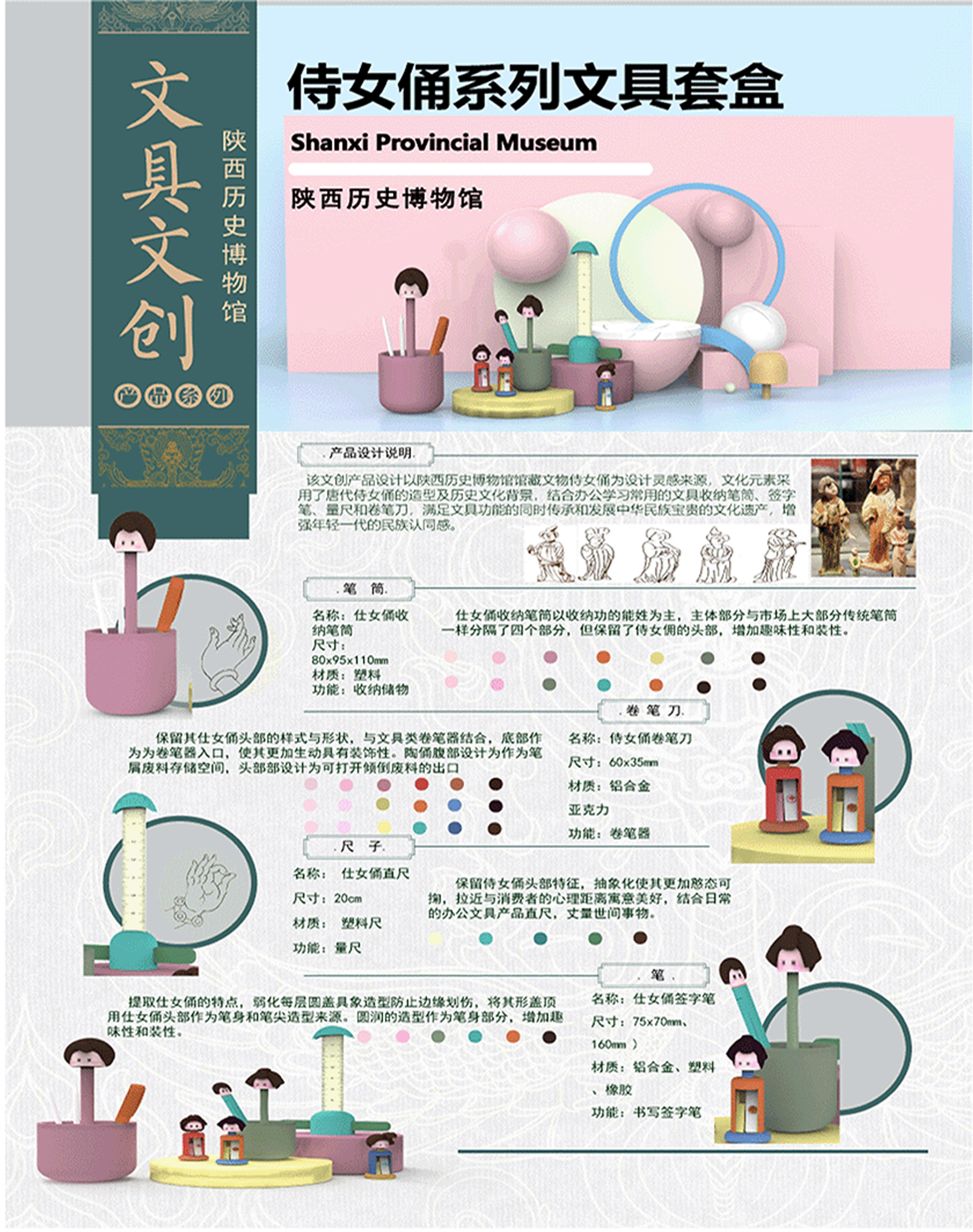该文创产品设计以陕西历史博物馆馆藏文物侍女俑为设计灵感来源,文化元素采用了唐代侍女俑的造型及历史文化背景,结合办公学习常用的文具收纳笔筒、签字笔、量尺和卷笔刀,满足文具功能的同时传承和发展中华民族宝贵的文化遗产,增强年轻一代的民族认同感