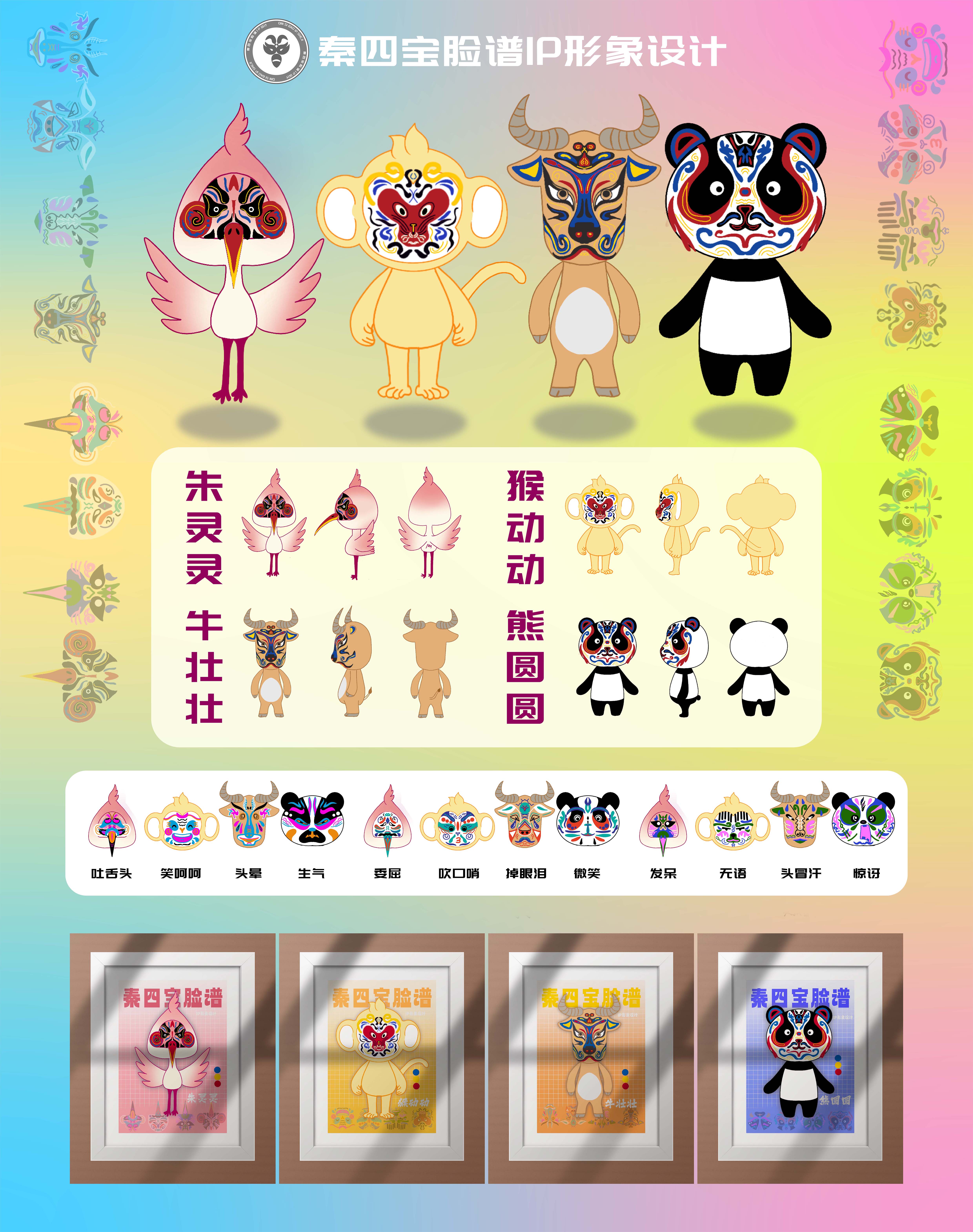 设计说明: 秦四宝脸谱IP形象设计是以秦岭四宝(朱鹮、金丝猴、羚牛、大熊猫)与陕西非遗文化·脸谱融合创造一个独特而富有个性的IP形象。以秦岭四宝形象特点设计图案和细节,选择鲜艳和饱和度高的颜色作为主要配色,以增强秦四宝的活泼形象。将形象设计融入陕西非遗文化脸谱的形式,如秦四宝表情包、形象海报等,以创造一个富有个性和吸引力、活力十足的IP形象。