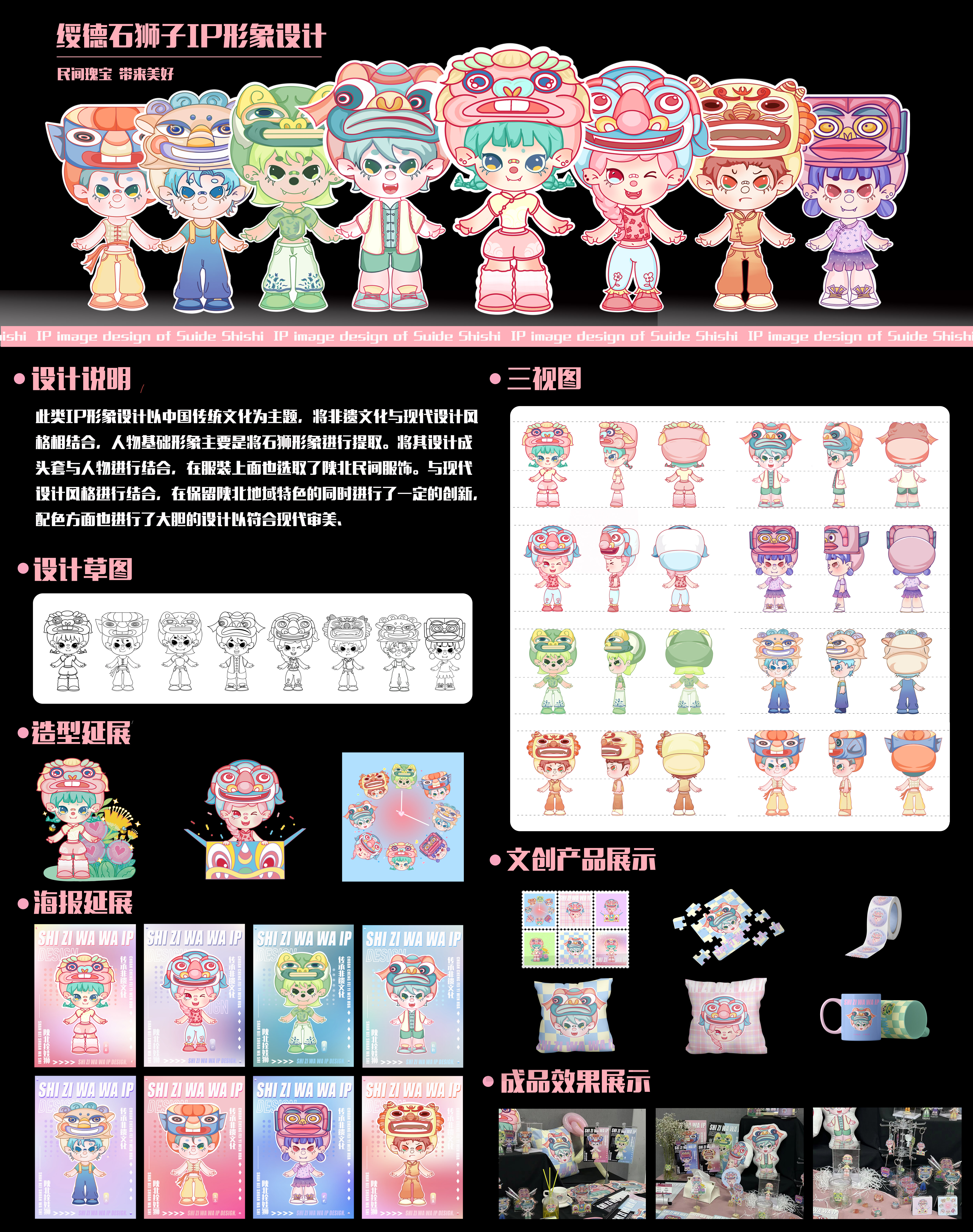 此类IP形象设计以中国传统文化为主题,将非遗文化与现代设计风格相结合,人物基础形象主要是将石狮形象进行提取。将其设计成头套与人物进行结合,在服装上面也选取了陕北民间服饰。与现代设计风格进行结合,在保留陕北地域特色的同时进行了一定的创新,配色方面也进行了大胆的设计以符合现代审美。