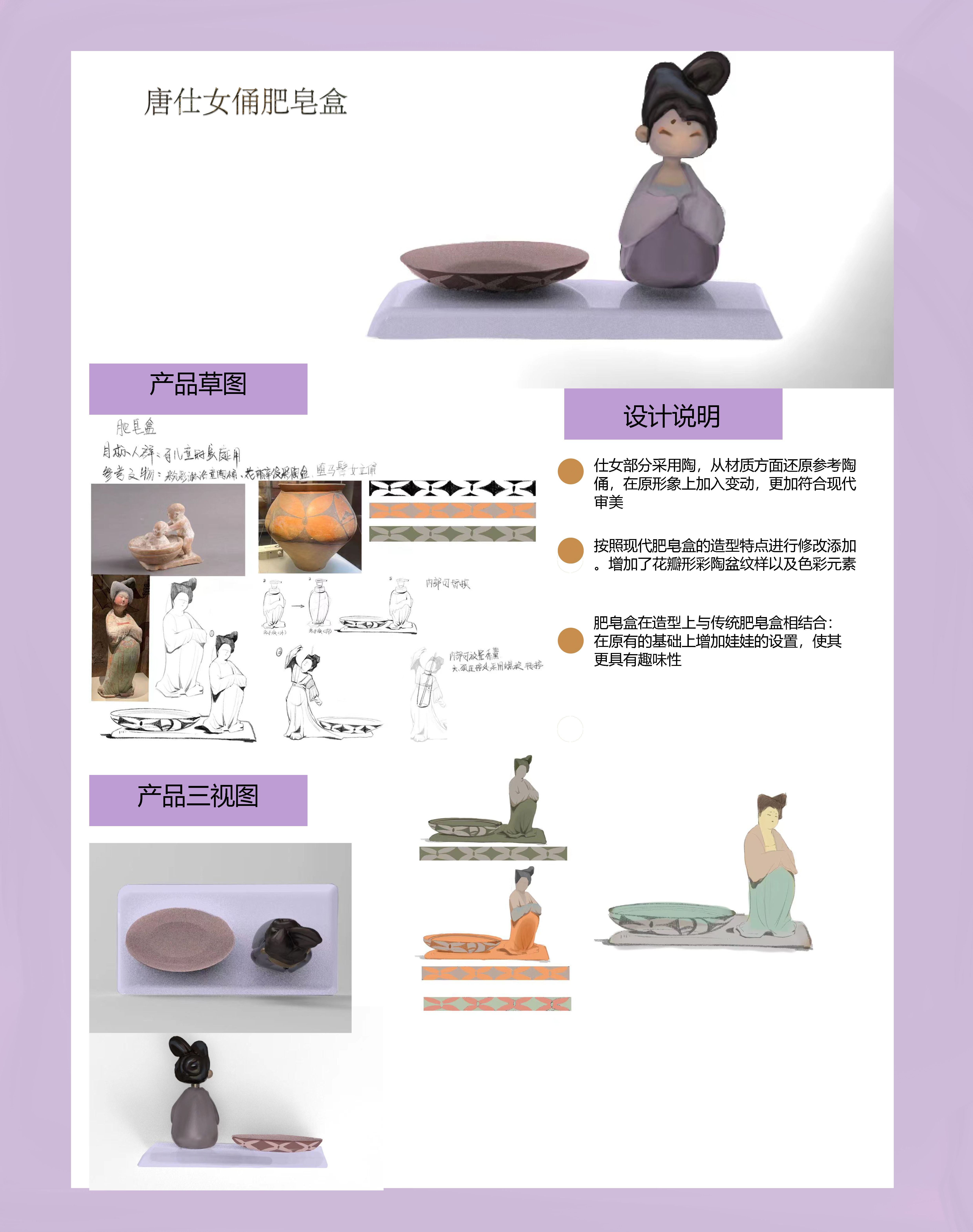 仕女部分采用陶,从材质方面还原参考陶俑,在原形象上加入变动,更加符合现代审美。按照现代肥皂盒的造型特点进行修改添加。增加了花瓣形彩陶盆纹样以及色彩元素。肥皂盒在造型上与传统肥皂盒相结合:在原有的基础上增加娃娃的设置,使其更具有趣味性。