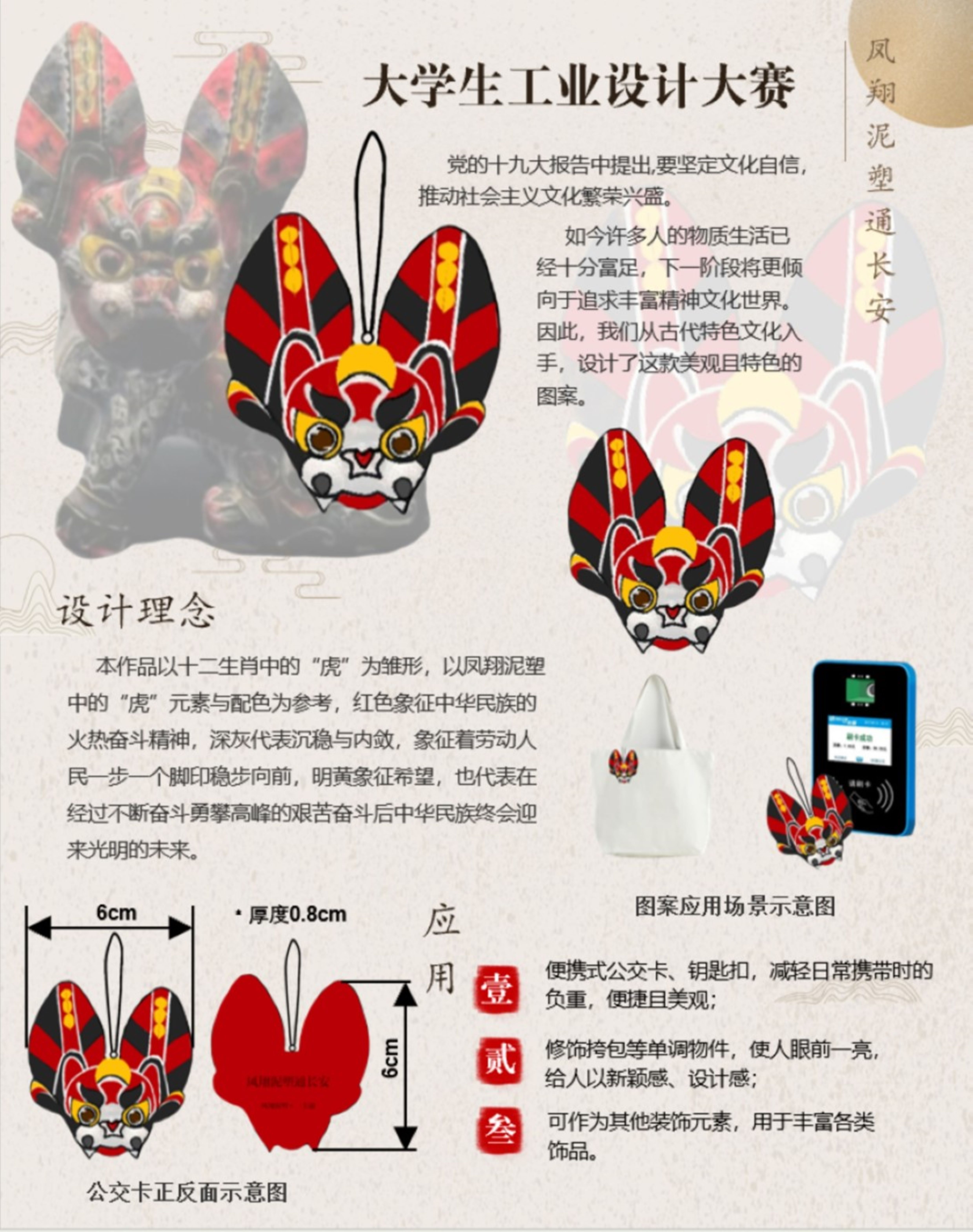 凤翔泥塑是陕西省凤翔县传统美术,国家级非物质文化遗产之一。本作品以陕西宝鸡凤翔泥塑中“虎”元素为灵感,结合当代青春化审美与实用性要求,将城市一卡通与凤翔泥塑外观特点相结合,有助于发扬国家非物质文化遗产,传承优秀传统文化,提升文化自信。
