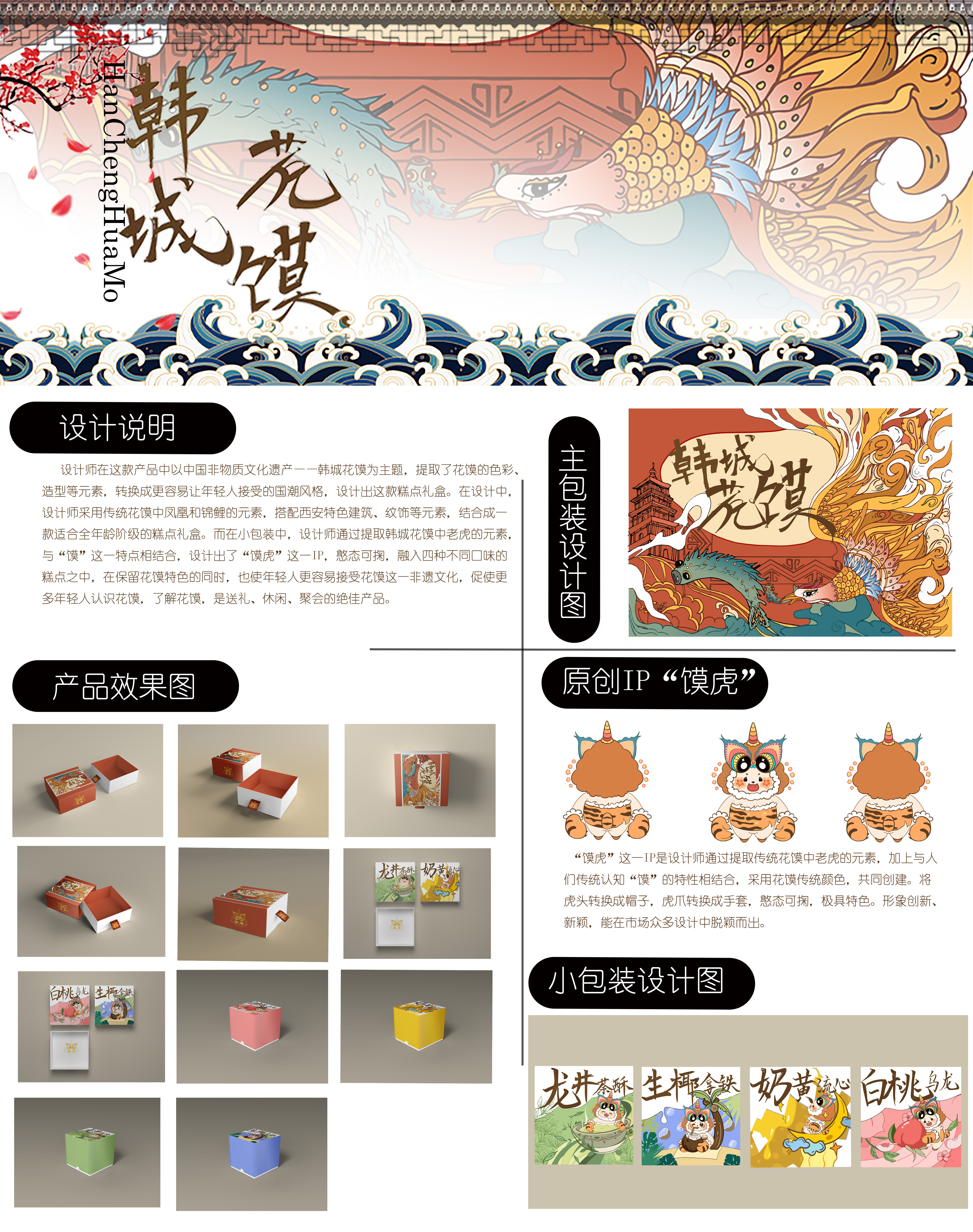 设这款产品以中国非物质文化遗产韩城花馍为主题,提取了花馍的色彩、造型等元素,使用国潮风格,采用传统花馍中凤凰和锦鲤的元素,搭配西安特色建筑、纹饰等,结合成一款老少皆宜的糕点礼盒。而在小包装中,设计师通过提取韩城花馍中老虎的元素,与“馍”这一特点相结合,设计出了“馍虎”这一IP,憨态可掬,融入四种不同口味的糕点之中,在保留花馍特色的同时,也促使更多年轻人认识花馍,了解花馍。