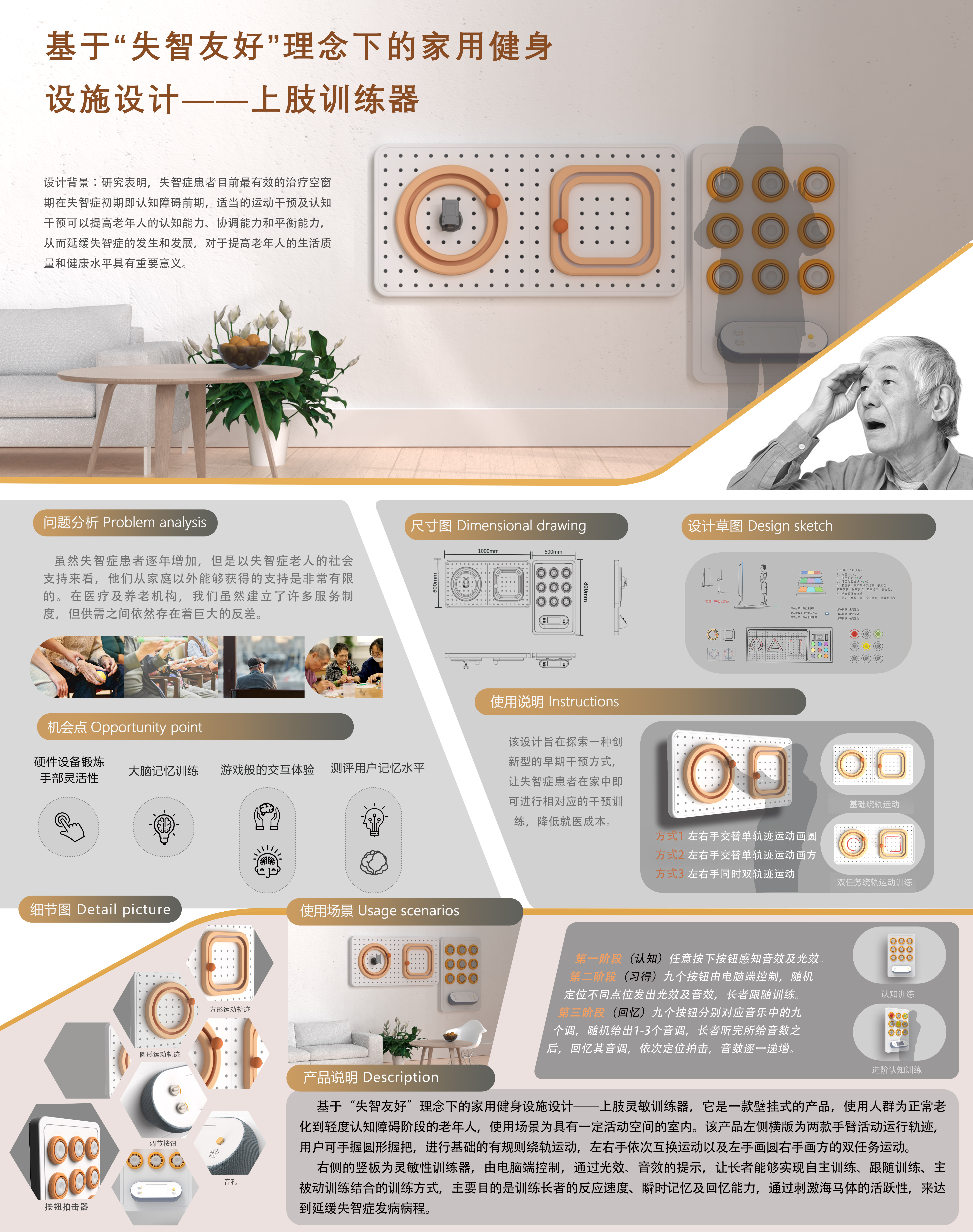 产品使用人群为正常老化到轻度认知障碍阶段的老年人,左侧横版为两款手臂活动运行轨迹,用户手握圆形握把,进行基础的有规则绕轨运动,左右手依次互换运动以及左手画圆右手画方的双任务运动。右侧的竖板为灵敏性训练器,由电脑端控制,通过光效、音效的提示,让长者能够实现自主训练、跟随训练、主被动训练结合的训练方式,主要目的是训练长者的反应速度、瞬时记忆及回忆能力,通过刺激海马体的活跃性,来达到延缓失智症发病病程。