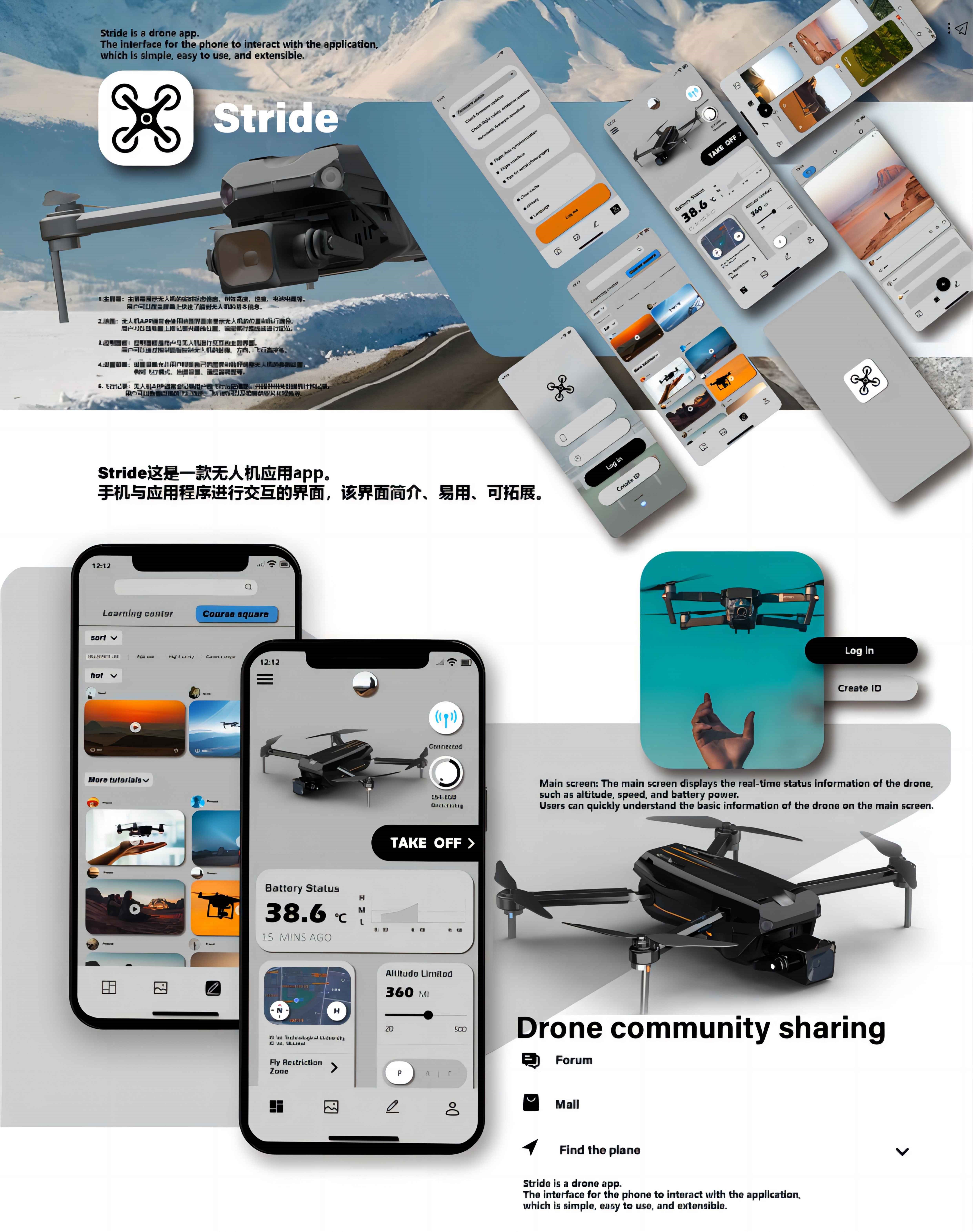 Stride这是一款无人机应用app手机与应用程序进行交互的界面,该界面简洁、易用、可拓展 主屏幕:主屏幕展示无人机的实时状态信息,例如高度、速度、电池电量等 地图:无人机APP通常会使用地图界面来显示无人机的位置和航行路径 控制面板:控制面板是用户与无人机进行交互的主要界面。 设置菜单:设置菜单允许用户根据自己的需求和偏好调整无人机的参数设置 飞行记录:无人机APP通常会记录用户的飞行历史