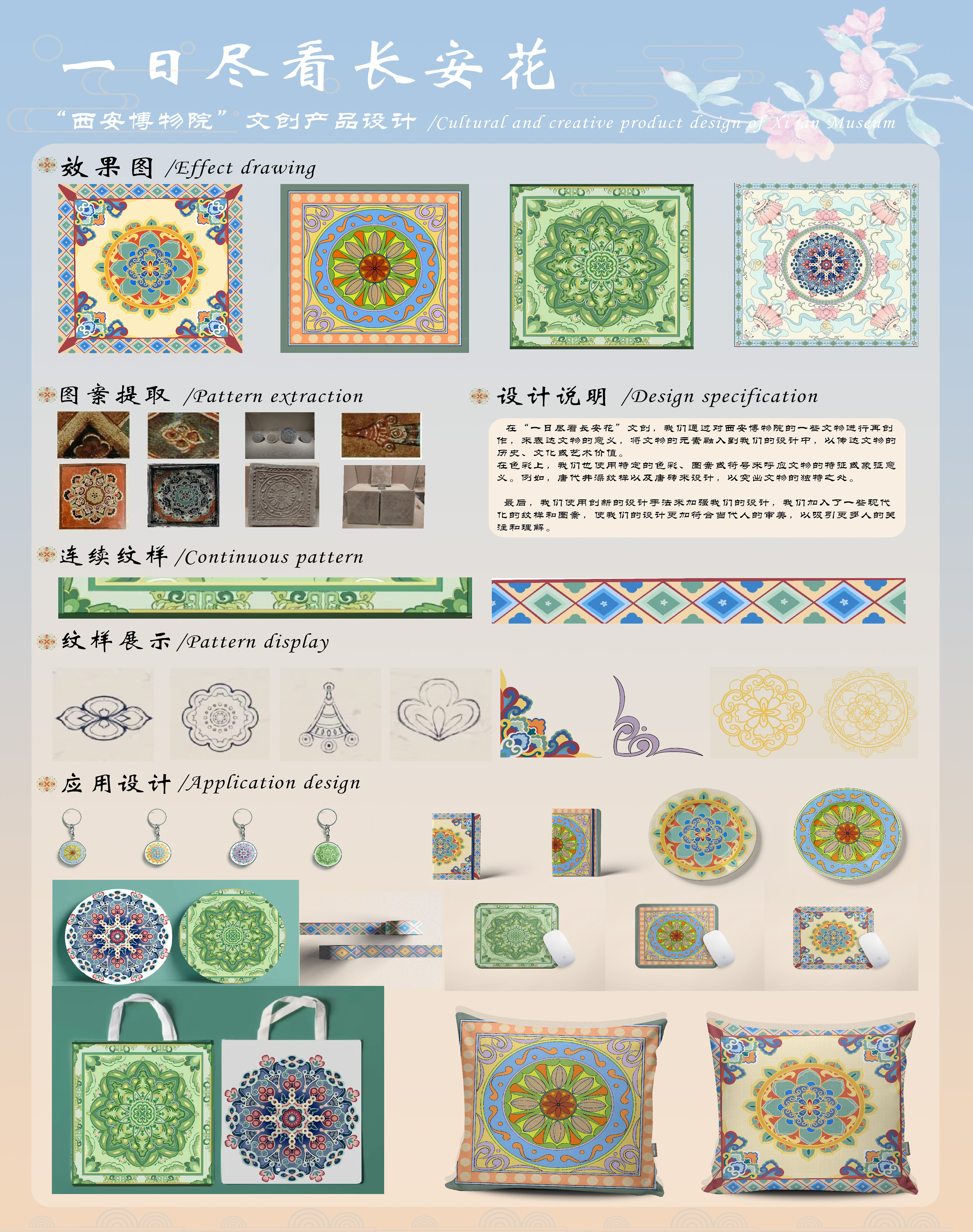 在“一日尽看长安花”文创,我们通过对西安博物院的一些文物进行再创作,来表达文物的意义,将文物的元素融入到我们的设计中,以传达文物的历史、文化或艺术价值。在色彩上,我们也使用特定的色彩、图案或符号来呼应文物的特征或象征意义。 最后,我们使用创新的设计手法来加强我们的设计,我们加入了一些现代化的纹样和图案,使我们的设计更加符合当代人的审美,以吸引更多人的关注和理解。