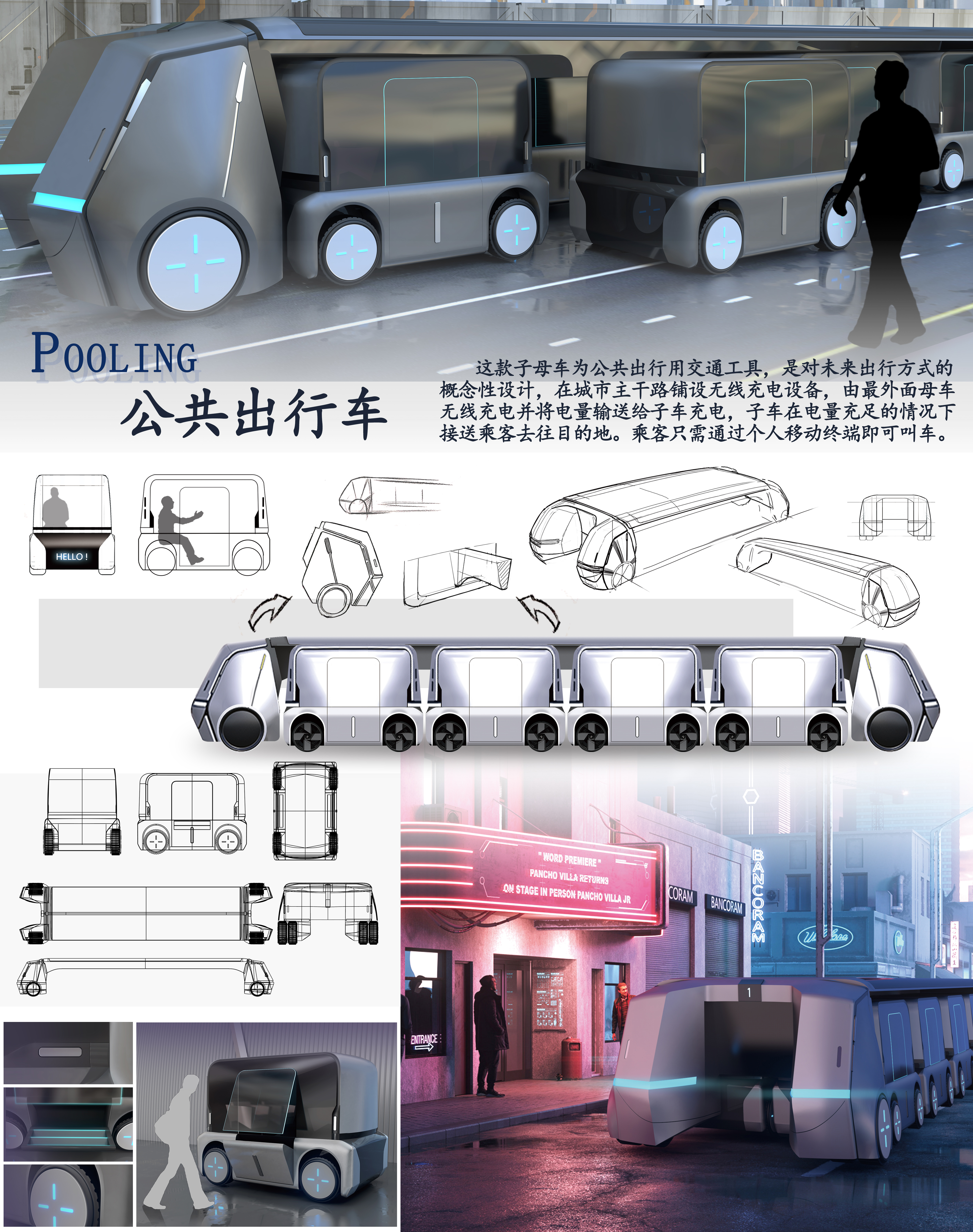 这款pooling公共出行车是基于无线充电技术的一款未来概念车型,旨在基于现有不成熟技术畅想探索未来交通发展趋势,车型分为大小两种,大车通过无线充电获得电量并将电量输送给小车,小车在电量充足的情况下脱离母车接送乘客。