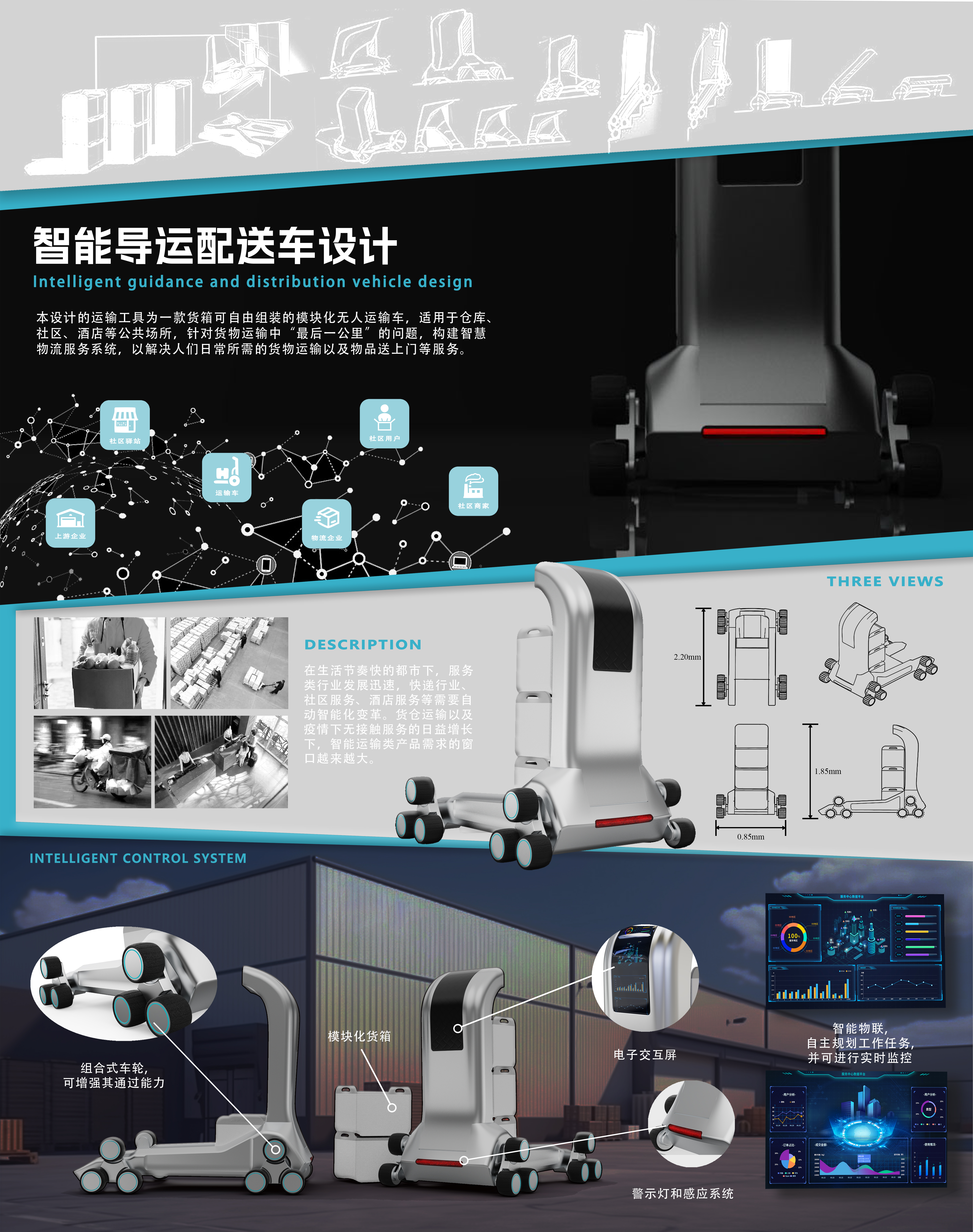 本设计的运输工具为一款货箱可自由组装的模块化无人运输车,适用于仓库、社区、酒店等公共场所,针对货物运输中“最后一公里”的问题,构建智慧物流服务系统,以解决人们日常所需的货物运输以及物品送上门等服务。