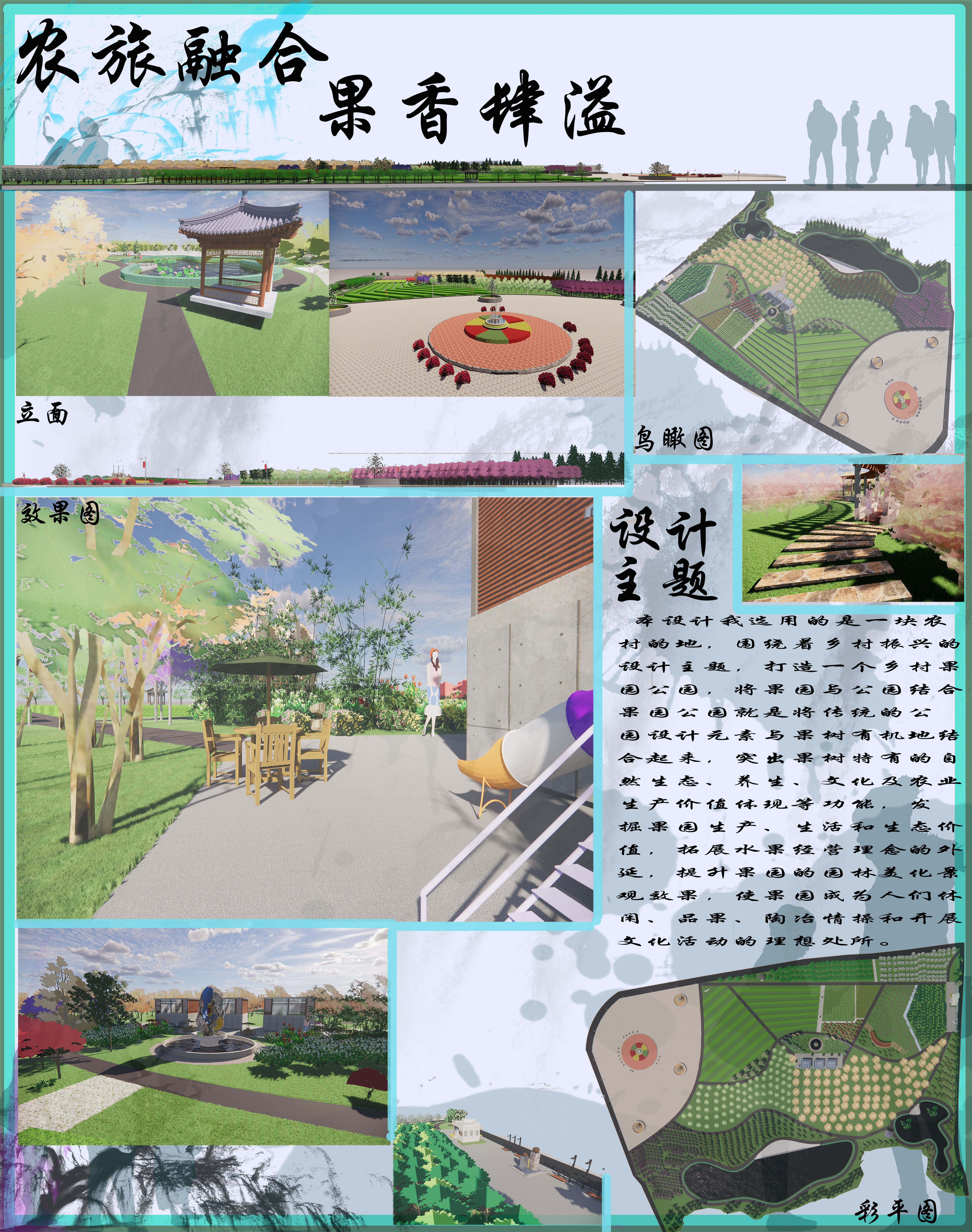 本设计我选用的是一块农村的地,围绕着乡村振兴的设计主题,打造一个乡村果园公园,将果园与公园结合果园公园就是将传统的公园设计元素与果树有机地结合起来,突出果树特有的自然生态、养生、文化及农业生产价值体现等功能,发掘果园生产、生活和生态价值,拓展水果经营理念的外延,提升果园的园林美化景观效果,使果园成为人们休闲、品果、陶冶情操和开展文化活动的理想处所。