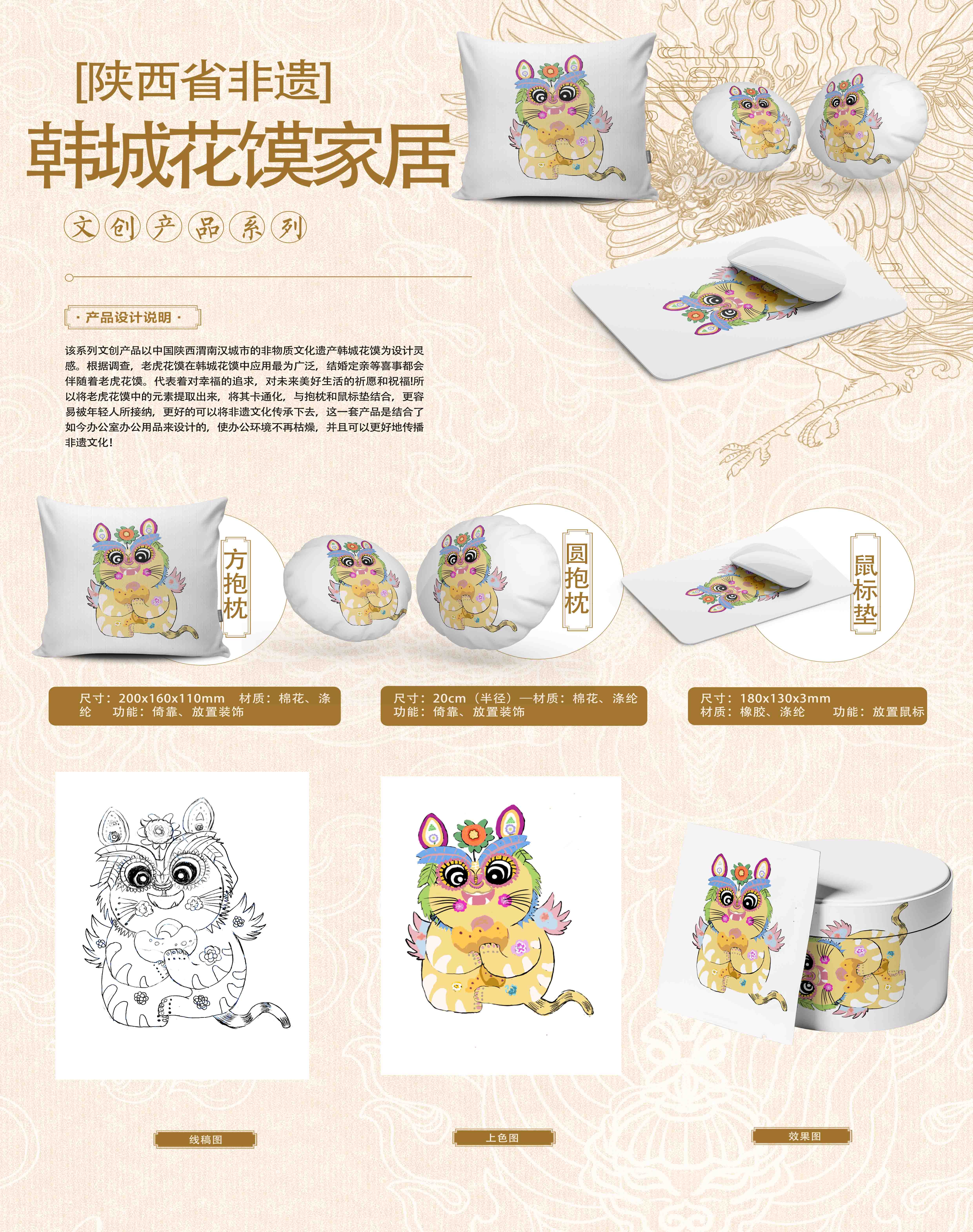 该系列文创产品以中国陕西渭南汉城市的非物质文化遗产韩城花馍为设计灵感。据调查,老虎花馍在韩城花馍中应用最为广泛,结婚定亲等喜事都会伴随着老虎花馍。代表着对幸福的追求,对未来美好生活的祈愿和祝福!所以将老虎花馍中的元素提取出来,将其卡通化,与抱枕和鼠标垫结合,更容易被年轻人所接纳,更好的可以将非遗文化传承下去这一套产品是结合了如今办公室办公用品来设计的使办公环境不再枯燥,并且可以更好地传播非遗文化!