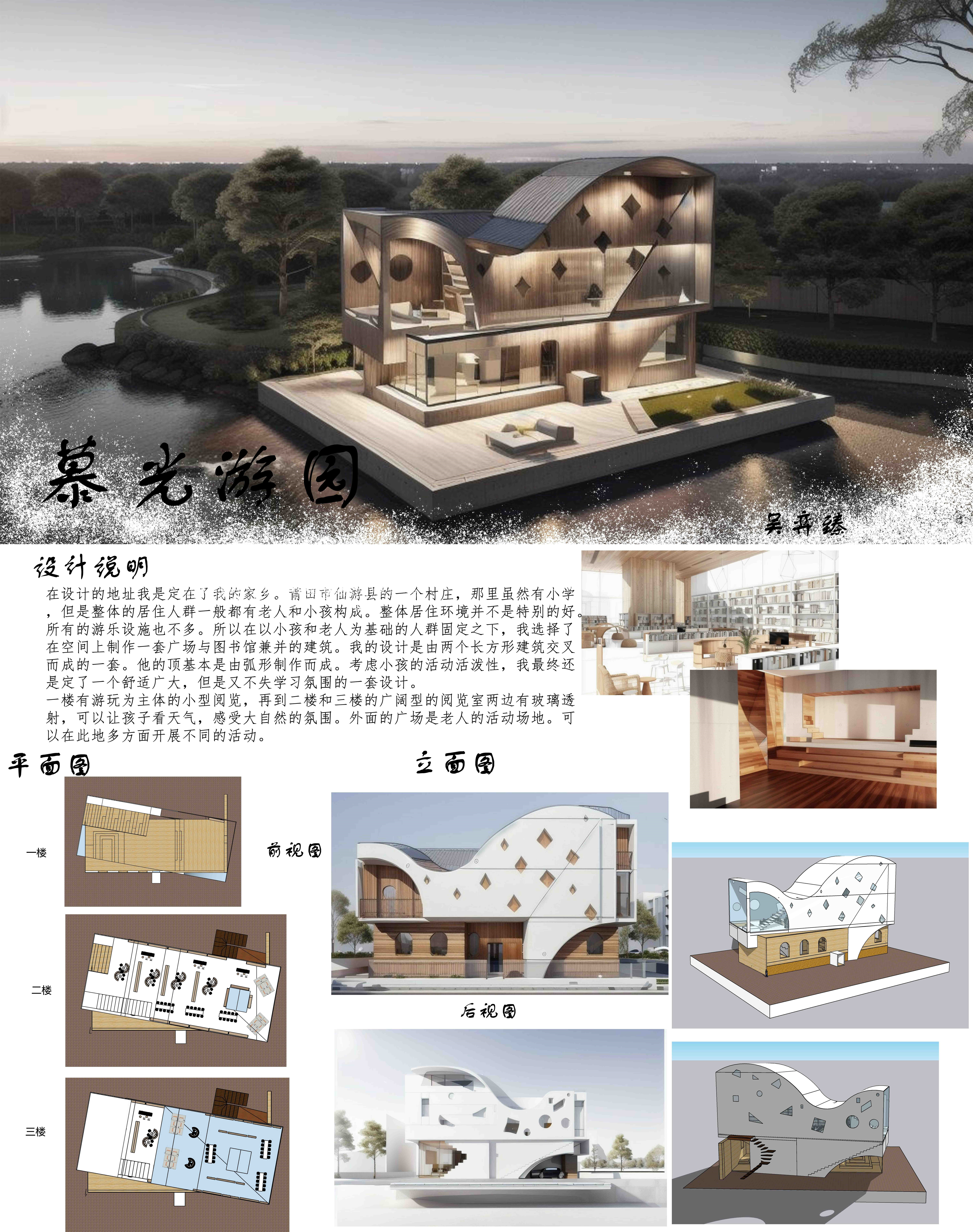 整体的居住人群一般都有老人和小孩构成。整体居住环境并不是特别的好。所有的游乐设施也不多。所以在以小孩和老人为基础的人群固定之下,在空间上制作一套广场与图书馆兼并的建筑。设计是由两个长方形建筑交叉而成的一套。顶基本是由弧形制作而成。。一楼有游玩为主体的小型阅览,再到二楼和三楼的广阔型的阅览室两边有玻璃透射,可以看天气,感受大自然的氛围。外面的广场是老人的活动场地。可以在此地多方面开展不同的活动。