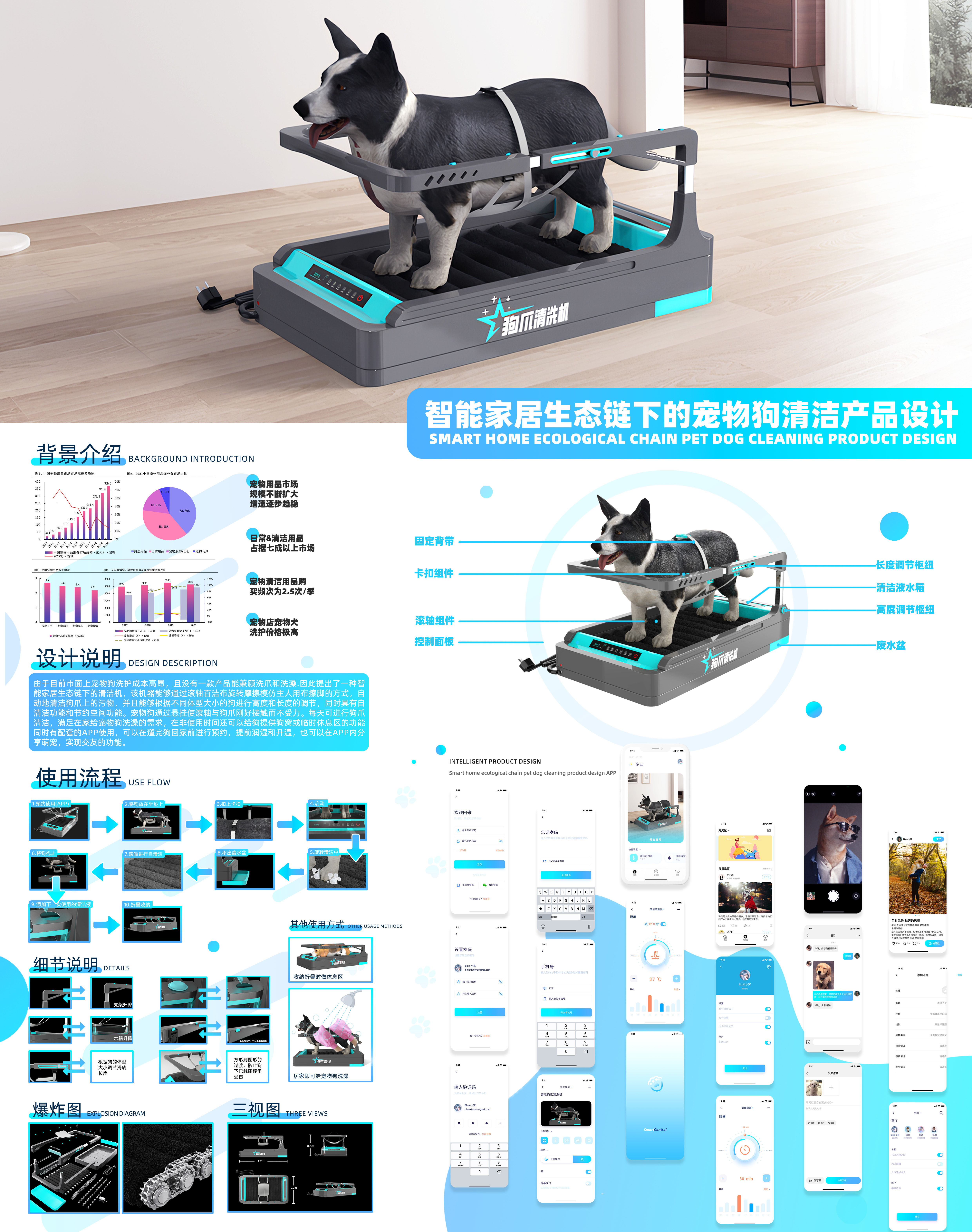 目前宠物店宠物狗洗护成本高昂。该设计能在家完成狗的洗护需求,能够通过滚轴百洁布旋转摩擦自动地清洁狗爪上的污物,能够根据狗的体型进行高度和长度的调节,同时具有自清洁功能和节约空间功能。宠物狗通过悬挂使滚轴与狗爪刚好接触而不受力,满足在家给宠物狗洗澡或擦脚的需求,在非使用时间还可以给狗提供临时休息的功能同时有配套的APP使用,可以在遛狗回家前进行预约,提前润湿和升温,也可以在APP内分享萌宠、交友。
