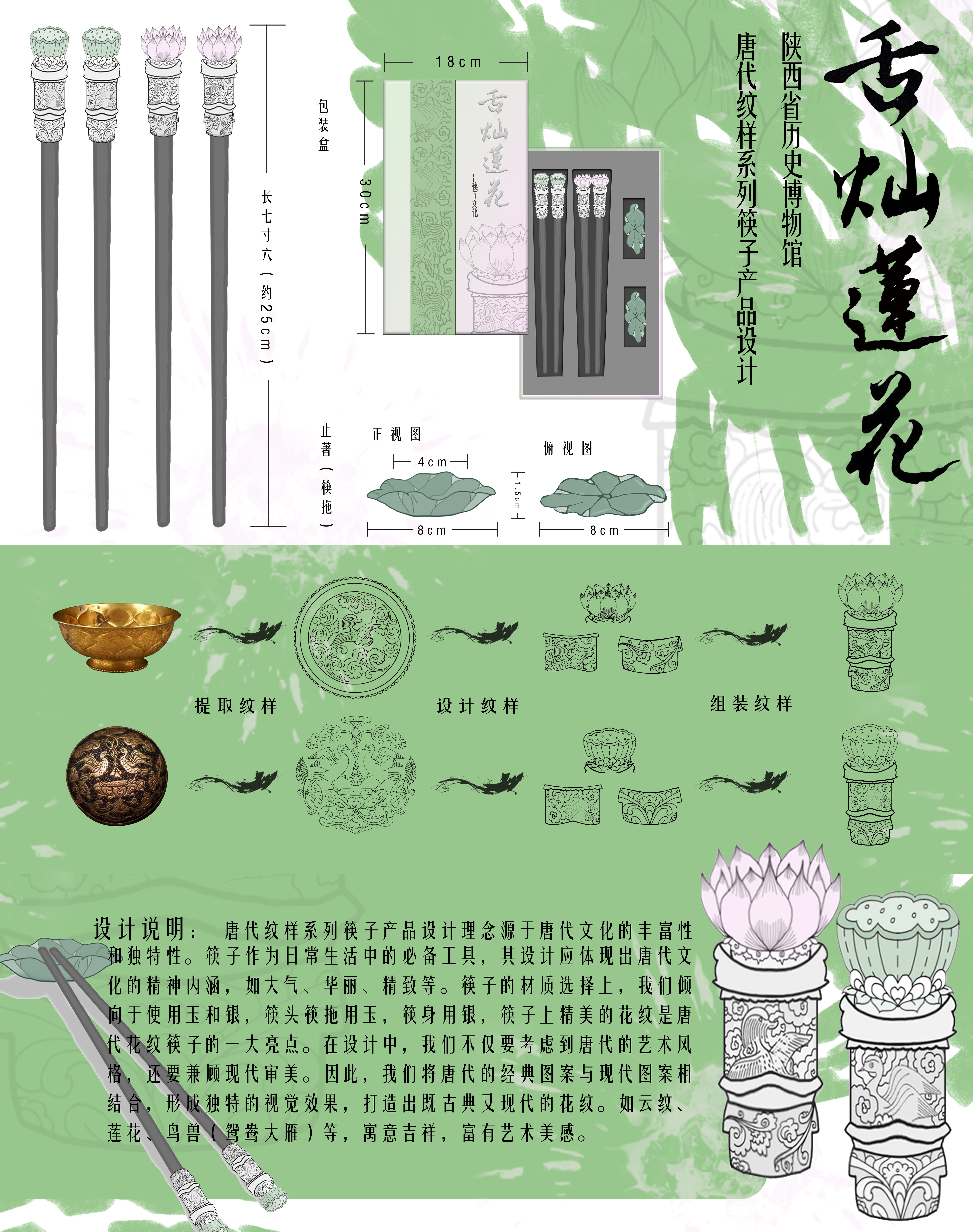 《舌灿莲花》设计说明: 唐代纹样系列筷子产品设计理念源于唐代文化的丰富性和独特性。筷子作为日常生活中的必备工具,其设计应体现出唐代文化的精神内涵,筷子的材质选择上,筷头筷托用玉,筷身用银,筷子上精美的花纹是唐代纹样的一大亮点。设计中,我们要考虑到唐代的艺术风格,还要兼顾现代审美。因此,我们将唐代的经典图案与现代图案相结合,形成独特的视觉效果,打造出既古典又现代的花纹,寓意吉祥,富有艺术美感。
