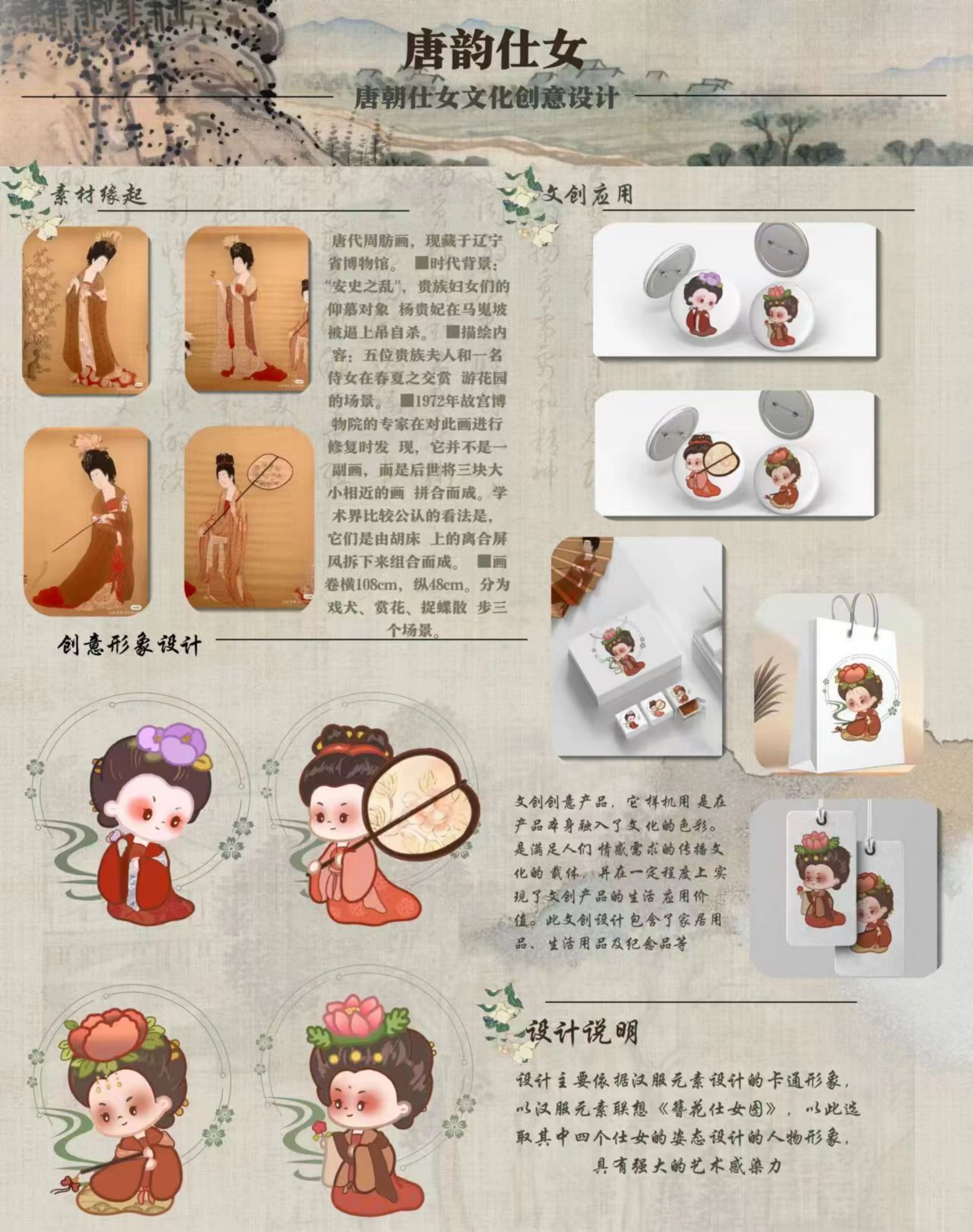 本设计灵感来源于唐代周昉绘制的《簪花仕女图》仕女IP形象生动活泼,更容易被年轻受众群体接受,簪花仕女形象根据原画进行了现在画风的诠释,使人物更生动,更有趣味性.
