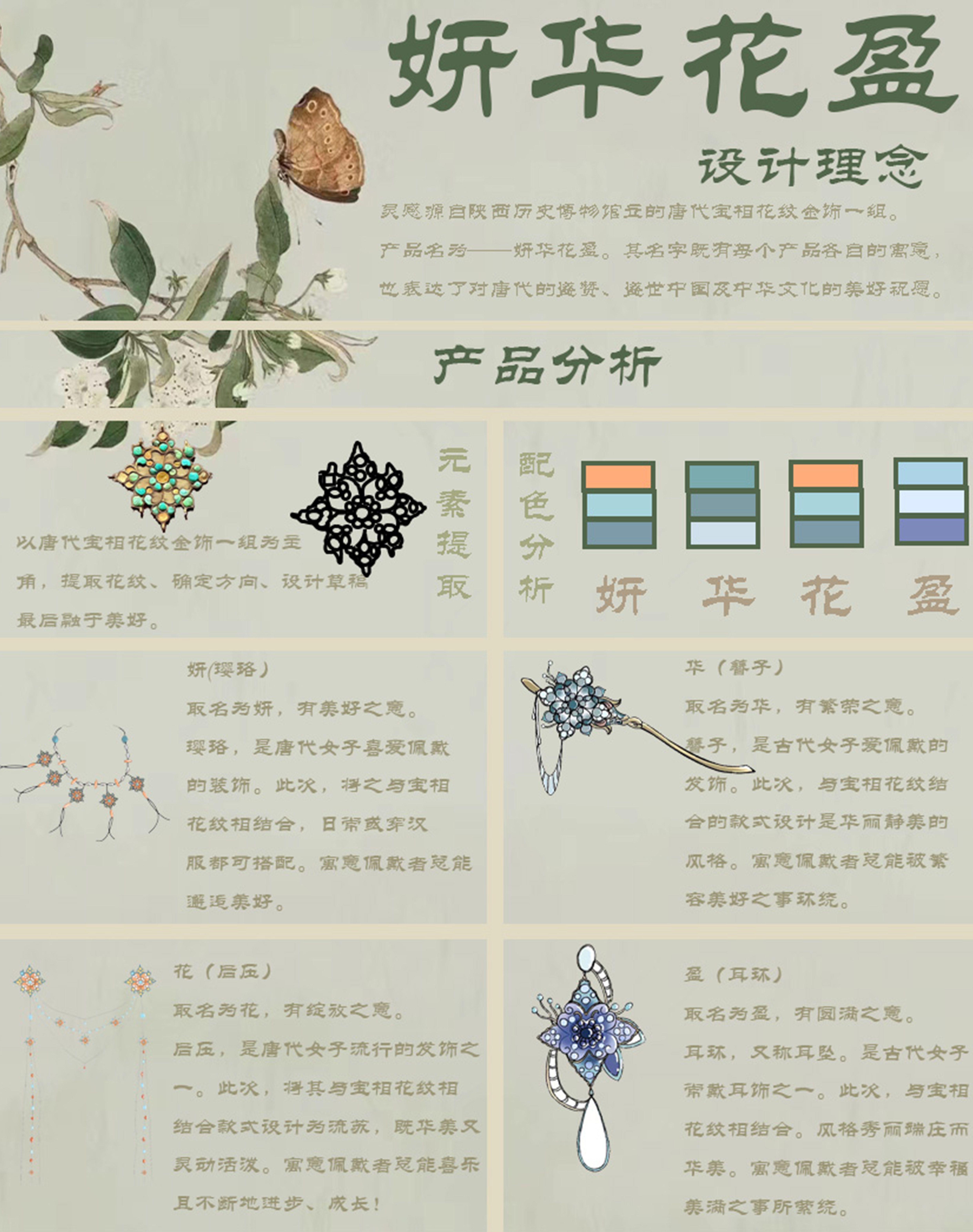 以陕西考古博物馆中的——唐代宝相花纹金饰一组为灵感,创作了适合搭配汉服和日常服饰的装饰品。其中有颈饰——妍(璎珞);头饰——华(簪子);发饰——花(流苏后压);耳饰——盈(耳环)。将对唐代的喜爱、设计理念全部都融于名字中。是极其具有中华民族文化内涵和巧妙构思的一组文创作品。