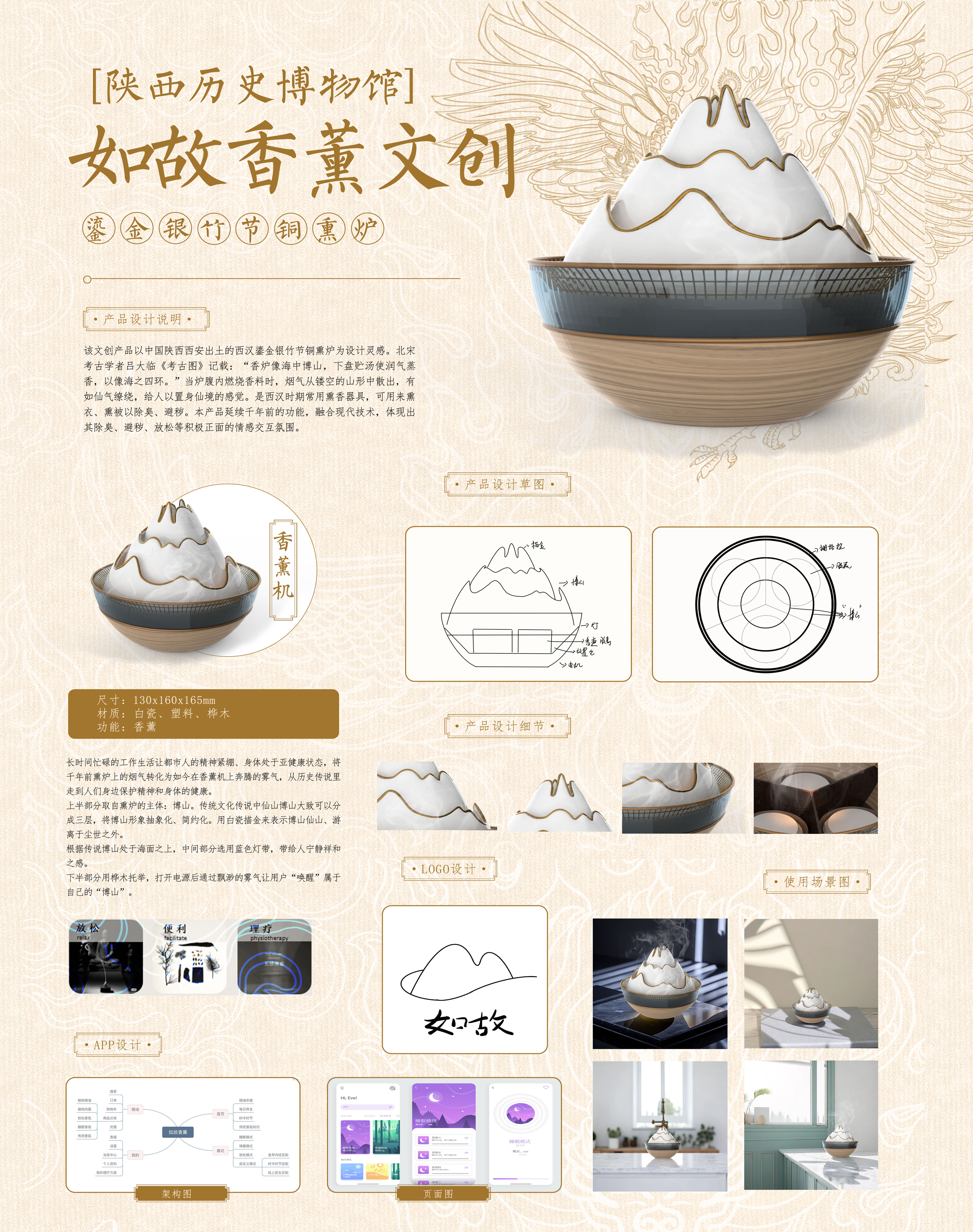 该文创产品以中国陕西西安出土的西汉鎏金银竹节铜熏炉为设计灵感。北宋考古学者吕大临《考古图》记载:“香炉像海中博山,下盘贮汤使润气蒸香,以像海之四环。”当炉腹内燃烧香料时,烟气从镂空的山形中散出,有如仙气缭绕,给人以置身仙境的感觉。是西汉时期常用熏香器具,可用来熏衣、熏被以除臭、避秽。本产品延续千年前的功能,融合现代技术,体现出其除臭、避秽、放松等积极正面的情感交互氛围。
