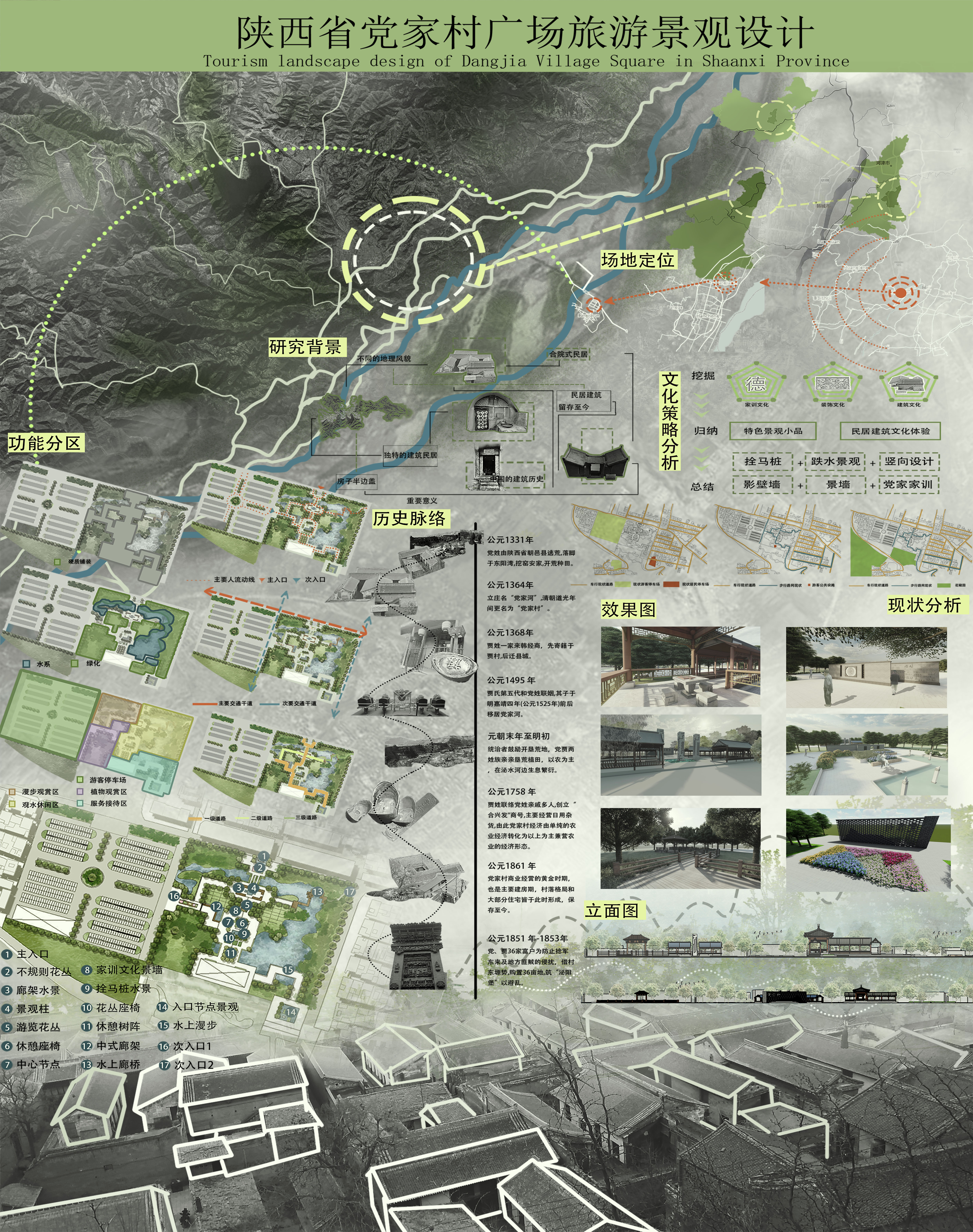 中国传统民居是地域文化与人居智慧的集中体现,陕西省韩城市西庄镇党家村是关中民居的典型代表,具有独特的文化底蕴和价值理念。在设计过程中,突出关中民居建筑文脉要素主题,从空间划分,到景观设施上都洋溢着其文化内涵,整个景观环境都与它的特色相协调,让游客在进入古民居遗址前充分体验党家村文化特色,同时感受关中传统民居建筑风格。通过景观设计的手段带动当地旅游业,从而提升党家村的经济,达到乡村振兴的目的。