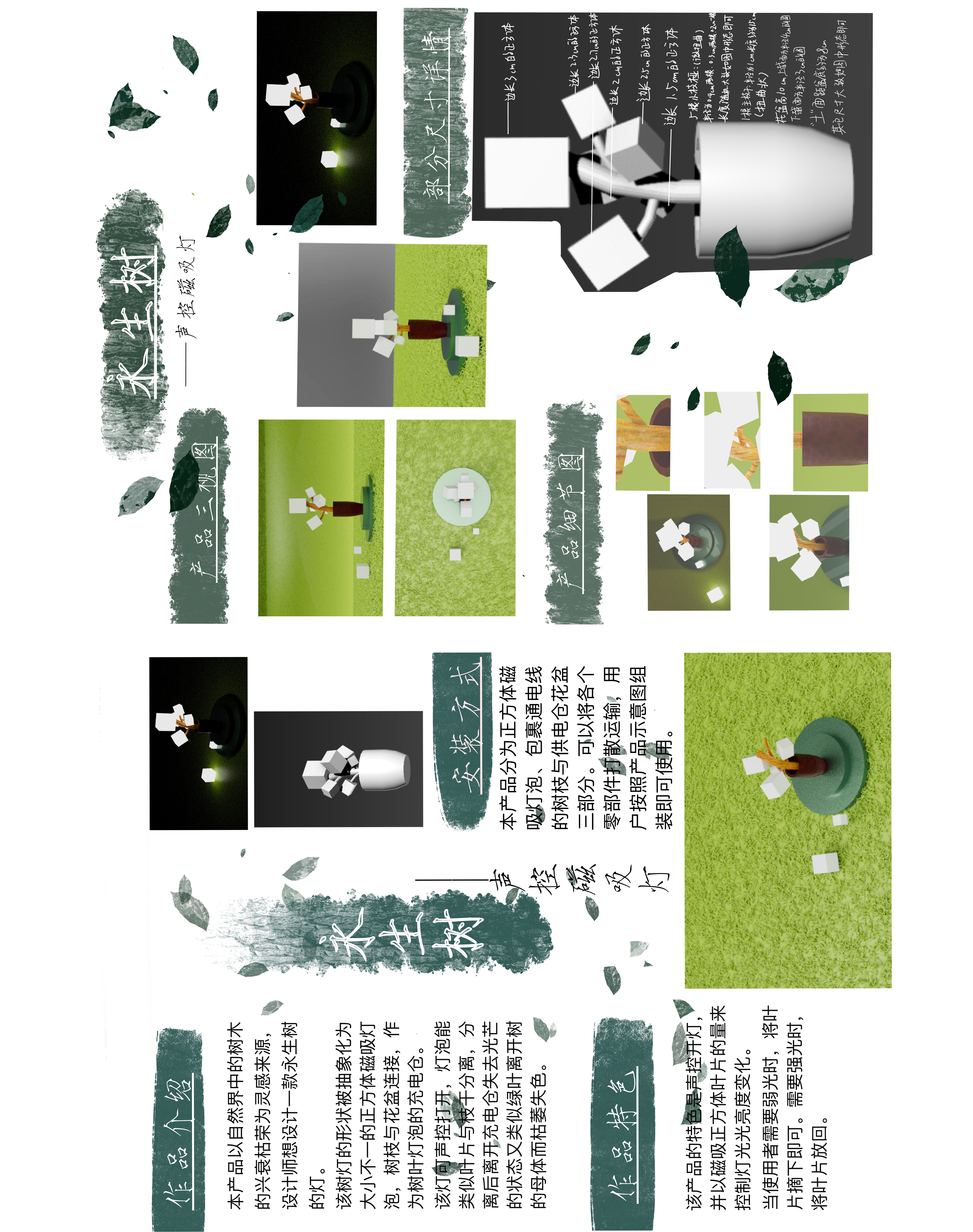 本产品以自然界中的树木的兴衰枯荣为灵感来源, 我想设计一款永生树的灯。 该树灯的形状被抽象化为大小不一的正方体磁吸灯泡,树枝与花盆连接,作为树叶灯泡的充电仓。 该灯可声控打开,灯泡能类似叶片与枝干分离,分离后离开充电仓失去光芒的状态又类似绿叶离开树的母体而枯萎失色。 该产品的特色是声控开灯,并以磁吸正方体叶片的量来控制灯光光亮度变化。 当使用者需要弱光时,将叶片摘下即可。需要强光时,将叶片放回。