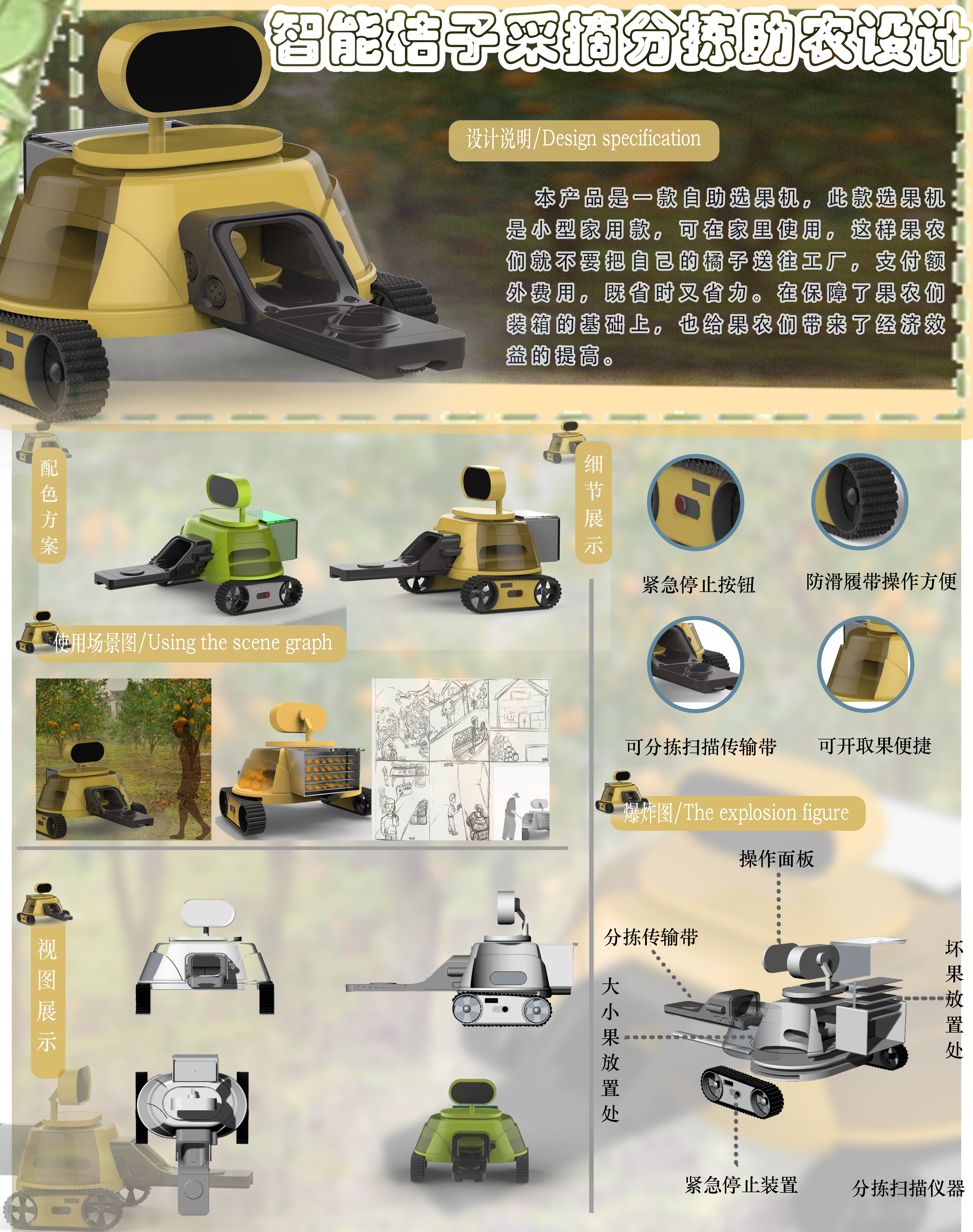 本产品是一款自助选果机,根据现有的选果机器,得知其痛点以及果农们所忧心的地方,现有机器庞大无比,一旦坏掉就得检修各个部分,还需要大量的人工服务,这也增添了本不该有的一些人工费,此款选果机是小型家用款,可在家里使用,这样果农们就不要把自己的橘子送往工厂,支付额外费用,既省时又省力。在保障了果农们装箱的基础上,也给果农们带来了经济效益的提高。