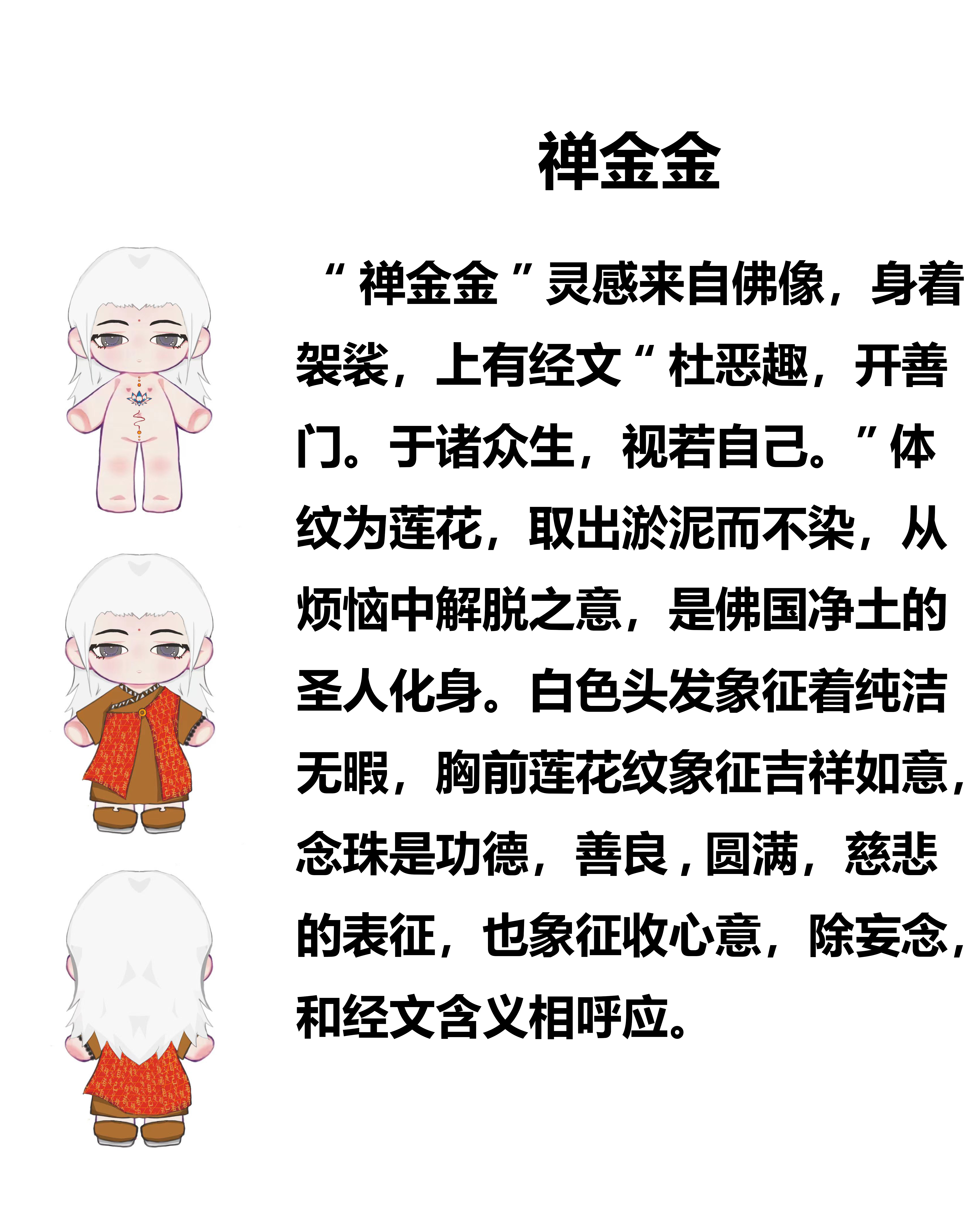 我们以西安博物院的三件“镇馆之宝”——隋代开皇四年董钦造鎏金弥陀佛像、秦代玉高足杯、唐代三彩腾空马为原型,进行了“萌宝总动员”系列棉花娃娃文创的设计。如今“棉花娃娃”等小众文化“出圈,我们追随潮流将文物元素融入娃娃设计,力求创作IP及周边产品打造潜力更强、受众更广、创新性与人文温情兼具的文创产品。在这其中,“禅金金”是身着袈裟的圣僧,与“隋代开皇四年董钦造鎏金弥陀佛像”对应,具体设计说明如图。