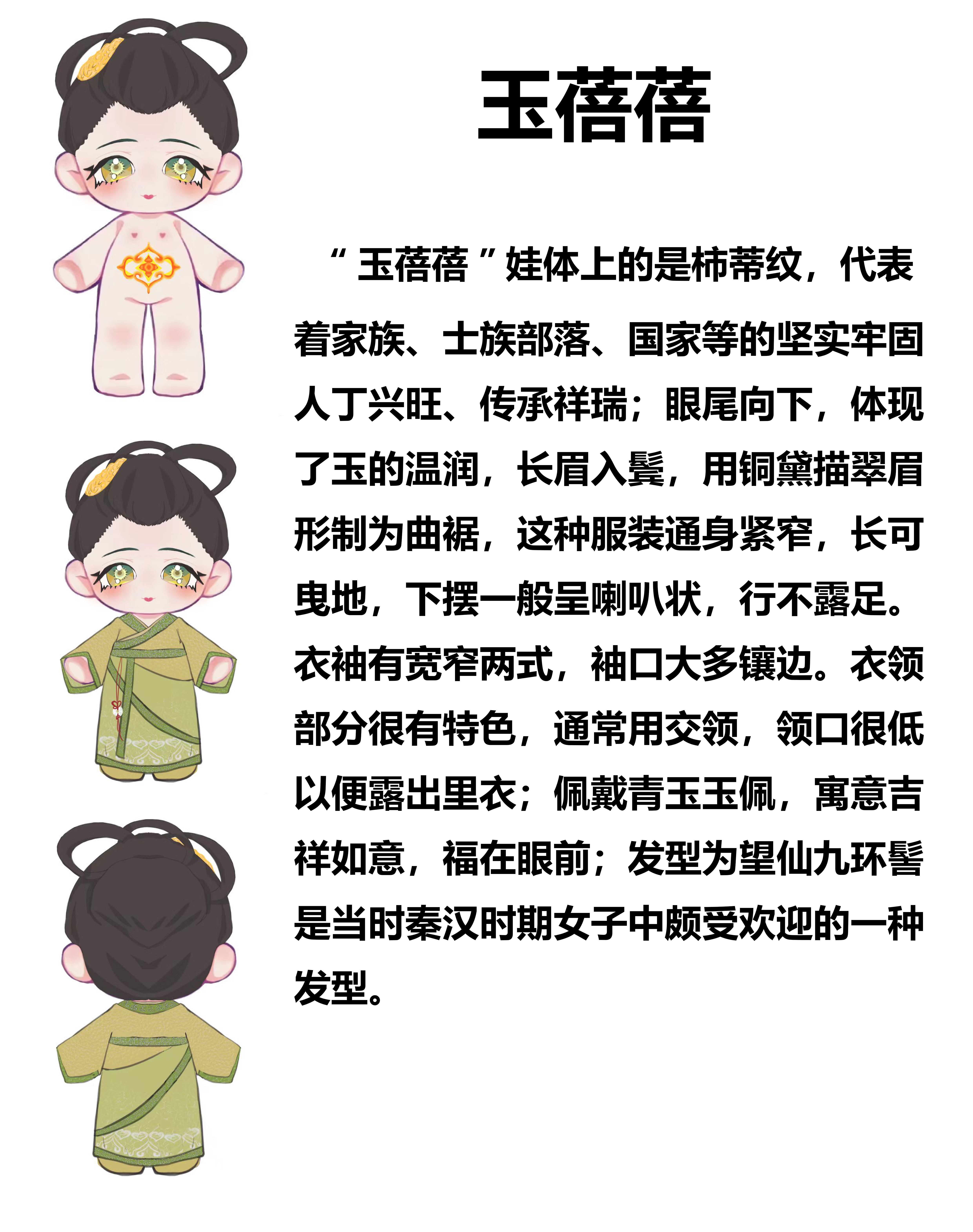 我们以西安博物院的三件“镇馆之宝”——隋代开皇四年董钦造鎏金弥陀佛像、秦代玉高足杯、唐代三彩腾空马为原型,进行了“萌宝总动员”系列棉花娃娃文创的设计。如今“棉花娃娃”等小众文化“出圈,我们追随潮流将文物元素融入娃娃设计,力求创作IP及周边产品打造潜力更强、受众更广、创新性与人文温情兼具的文创产品。在这其中,“玉蓓蓓”是位温婉端庄的秦朝少女形象,对应的是“秦代玉高足杯”。具体设计说明如图。