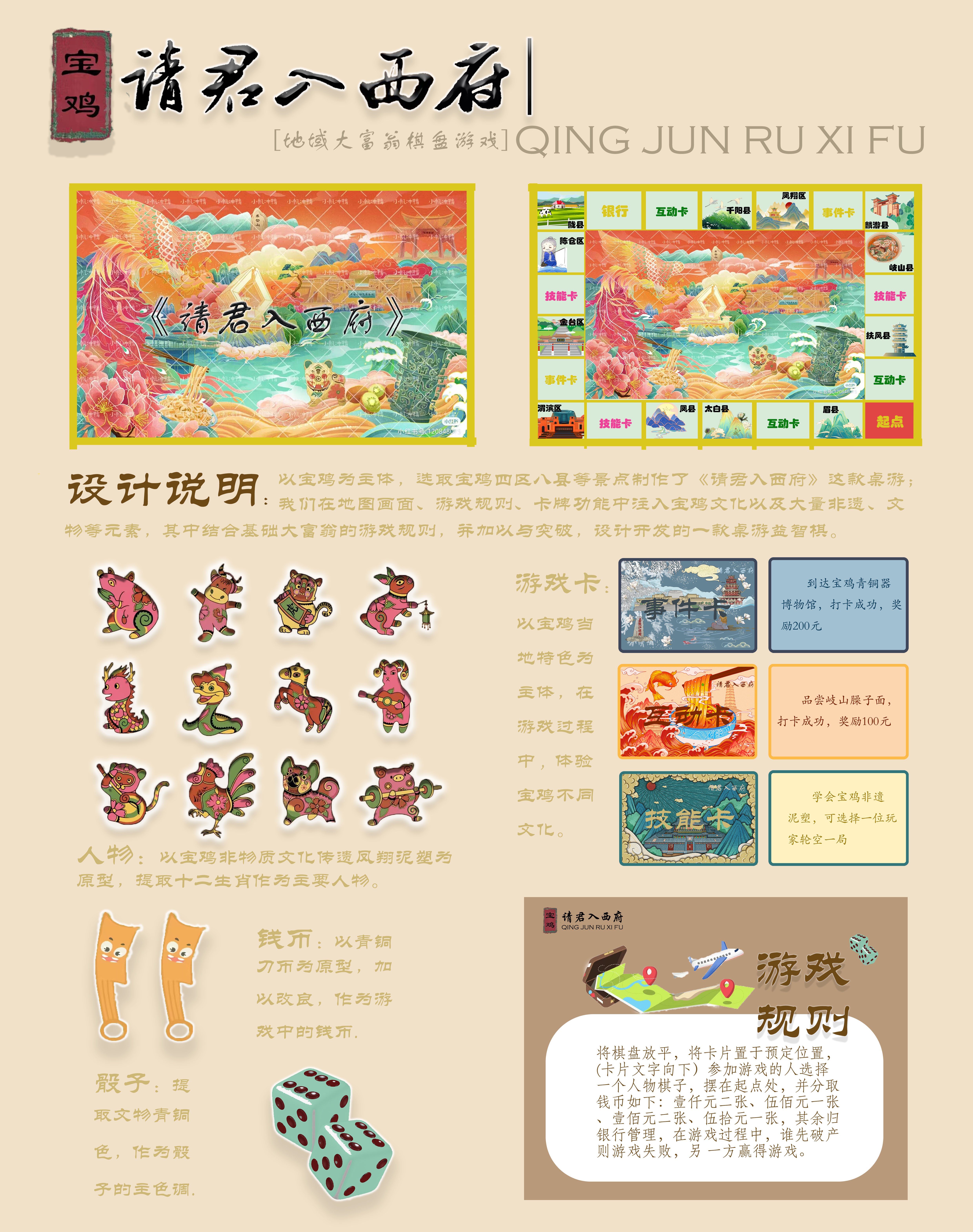 我们以宝鸡为主体,选取宝鸡四区八县等景点制作了《请君入西府》这款桌游我们在地图画面、游戏规则、卡牌功能中注入宝鸡文化以及大量非遗、文物等元素其中结合基础大富翁的游戏规则,并加以与突破,设计开发的一款桌游益智棋。希望大家可以感受宝鸡非遗文化,体验当地文化特色,看中国,来宝鸡。
